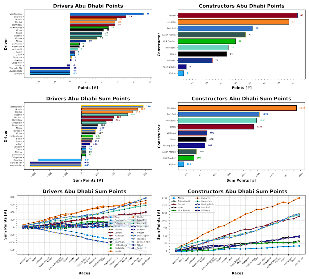 In the final round of the season, it’s the outgoing world champion Max Verstappen who takes the top spot with a dominant win, coming home with 46 points. In second place, it’s a return to form for Ferrari’s Charles Leclerc with 35 points, ahead of Lando Norris in third place with 29 points. Piastri and Hamilton tie for fourth place with 28 points, while Nico Hulkenberg rounds out the top five with 24. Isack Hadjar comes away from the final race with -2 points at the bottom of the grid, behind Franco Colapinto who has another pointless race. Liam Lawson and Yuki Tsunoda tie for third-worst with 1 point, behind Sainz and Gasly with 3. Kimi Antonelli finishes his rookie season with 5 points.