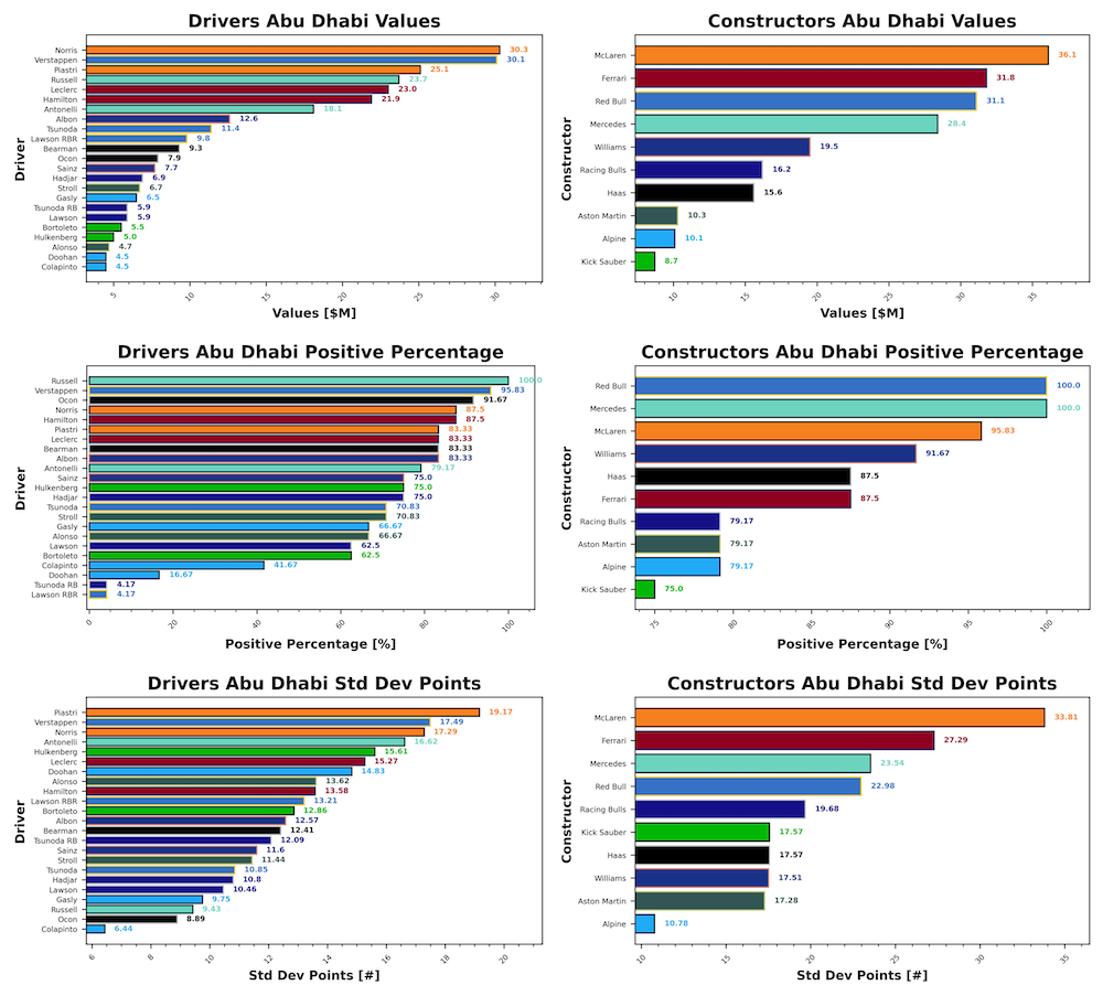 Norris finishes the season with a value of 30.3, with Verstappen close behind at 30.1. Piastri’s value has dropped lately, and he finishes the season at 25.1. George Russell’s consistency is rewarded with a value of 23.7, with Charles Leclerc in fifth at 23.0. Franco Colapinto finishes his first “full” season with a value of 4.5, behind Fernando Alonso at 4.7. The Kick Saubers next with Hulkenberg at 5.0 and Bortoleto at 5.5. Liam Lawson rounds out the cheap five with a value of 5.9.