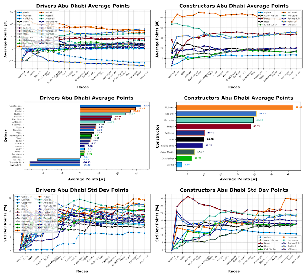 Colapinto remains your most consistent driver of the season with a standard deviation of 6.44 points. He’s joined by Ocon, Russell, Gasly, and Lawson with standard deviations of 8.9, 9.4, 9.8, and 10.5. Your least reliable driver of the season is Oscar Piastri with a standard deviation of 19.2, followed by Max Verstappen with 17.5, Lando Norris with 17.3, Antonelli with 16.6, and Nico Hulkenberg with 15.6.