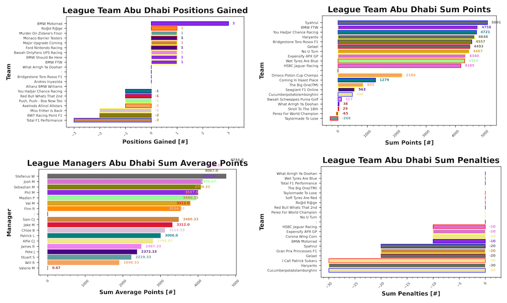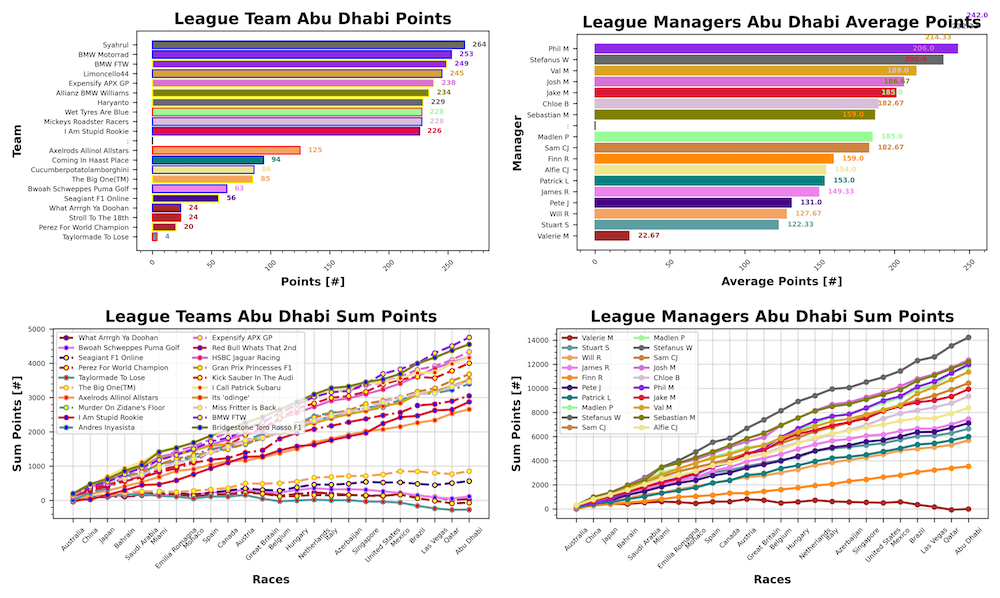 With the points all settled, it’s Max Verstappen who takes the 2025 Fantasy title with 776 points, ahead of Lando Norris in second with 707. Oscar Piastri rounds out the rostrum with 644 points ahead of George Russell with 580. In the battle at Ferrari, it’s Charles Leclerc who takes the honours in fifth with 407 points to Lewis’ 391. Kimi Antonelli secures a decent sixth place in his rookie season with 311, followed by fellow rookie Bearman with 206. Albon next with 198 points, ahead of Tsunoda and Ocon with 177. Hulkenberg just misses out on the top ten with 147 points, 1 ahead of Stroll in twelfth with 146. Sainz next in his first season at Williams with 130 points, ahead of Isack Hadjar with 111. Liam Lawson finishes his season with 59 points, just 1 ahead of Gasly and Alonso with 58 points. Gabby Bortoleto finishes in seventeenth with 53 points, having quite the advantage over Franco Colapinto who secures 8 points overall in technically last. Finally, the three inactive drivers: Doohan with -544, Tsunoda Racing Bulls with -644, and Lawson Red Bull with -645.