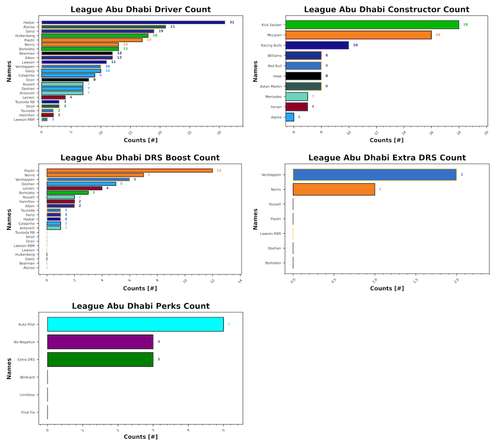 Isack Hadjar completes the season as the most popular driver for your teams, with a total of 31 appearances across the grid. He’s followed by Fernando Alonso with 21 and Carlos Sainz with 19. Nico Hulkenberg comes home in fourth with 18, followed by Oscar Piastri with 17 selections. Your least selected drivers this week were Lewis Hamilton and Yuki Tsunoda with 2 selections. They’re followed by Lance Stroll with 3, and Charles Leclerc with 4. Russell and Antonelli next with 7 selections, with Esteban Ocon rounding out the bottom five with 8 selections.