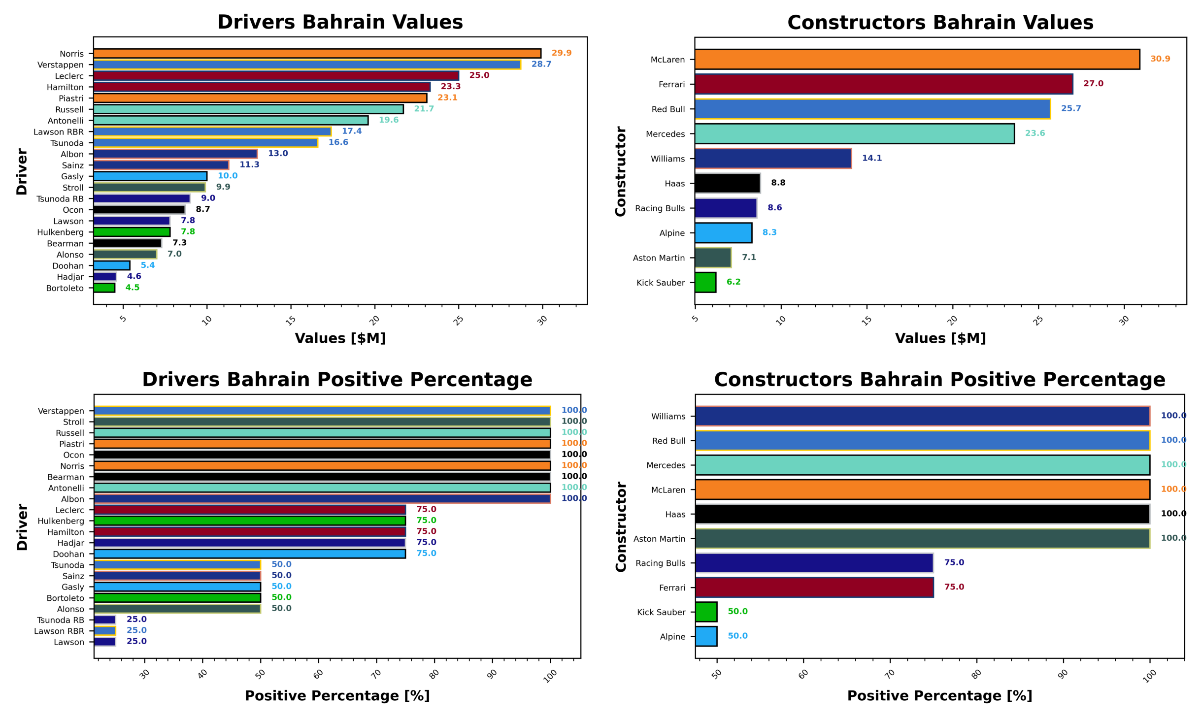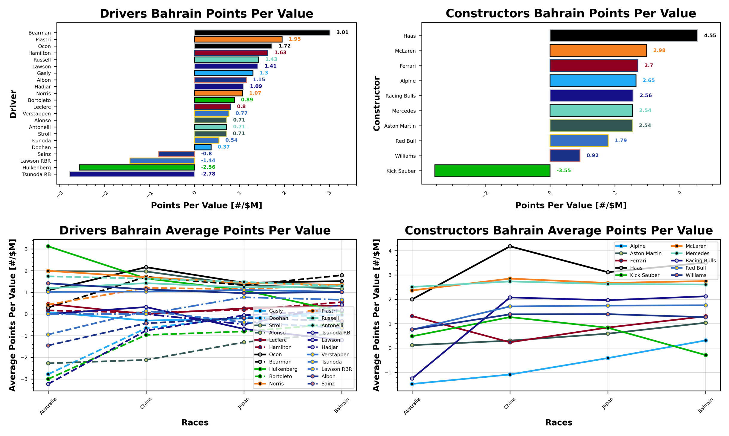 It seems the driver market has settled down a little now, and Lando Norris continues to rise in value, going into Bahrain his value was $29.9. Max Verstappen is next, increasing slightly to $28.7, ahead of Charles Leclerc with $25.0 and Lewis Hamilton with $23.3. Oscar Piastri’s value increases this week to $23.1. Gabriel Bortoleto was your cheapest option this week, sitting at $4.5, behind Isack Hadjar with $4.6. Jack Doohan was your next cheapest option with a value of $5.4, behind Fernando Alonso and Oliver Bearman with values of $7.0 and $7.3.