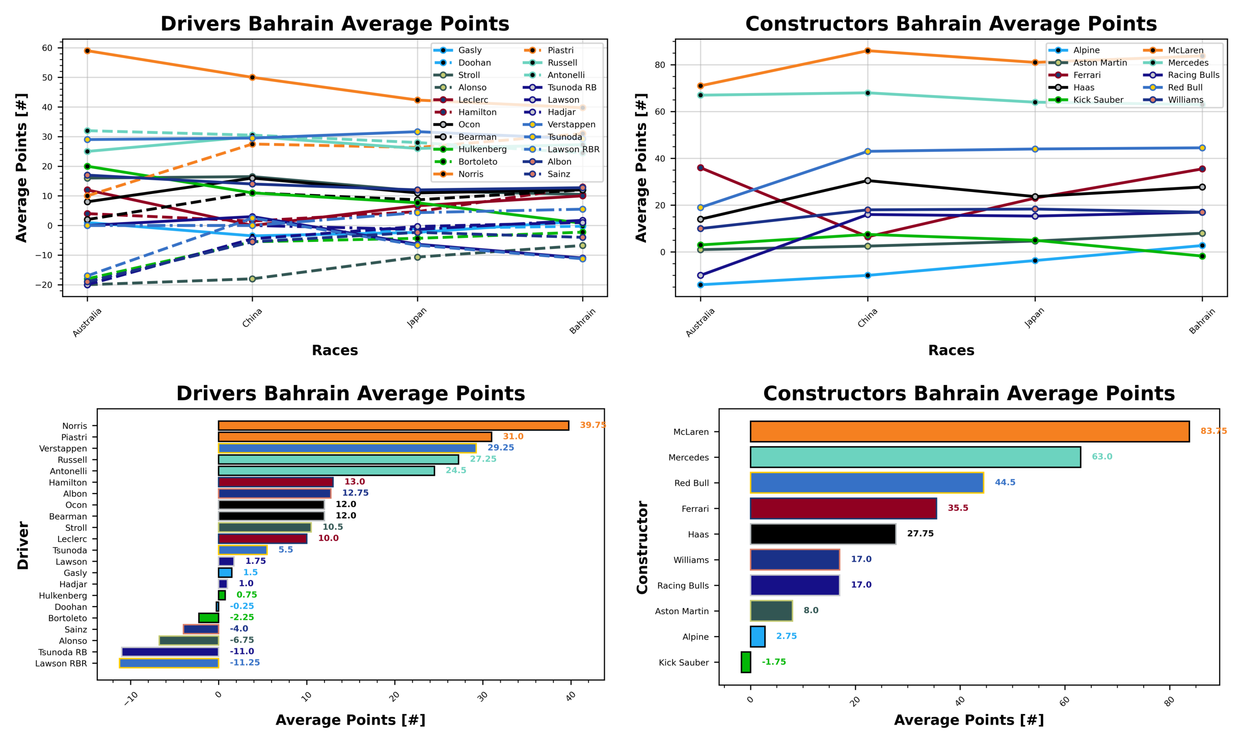 McLaren, as your championship leaders, are averaging 83.75 points per race, ahead of Mercedes with 63 points per race, and Red Bull with 44.5 points per race. Kick Sauber are scoring -1.75 points per race, behind Alpine with 2.75 points per race, and Aston Martin with 8 points per race.