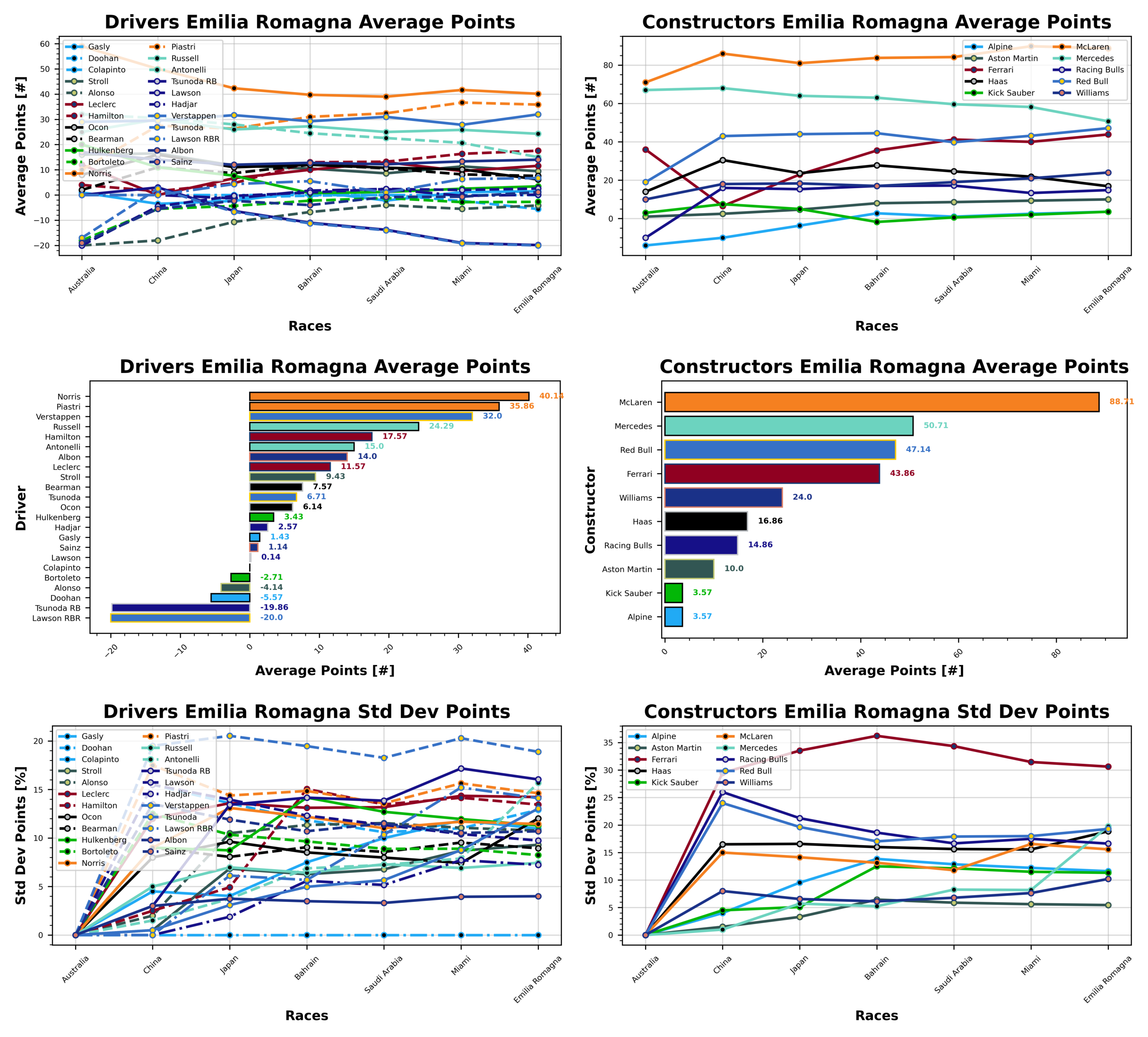 The standard deviation is a measurement of consistency, so you’re looking for the lowest number here, and what it represents is the spread of results. For instance, Albon is averaging 14 points per race, with a spread of 4. Thus it is likely that he is scoring between 10 and 18 points. 68% of the time he will score within this range, and 98% of the time he scores between 6 and 22 points. So consistency is indeed key.