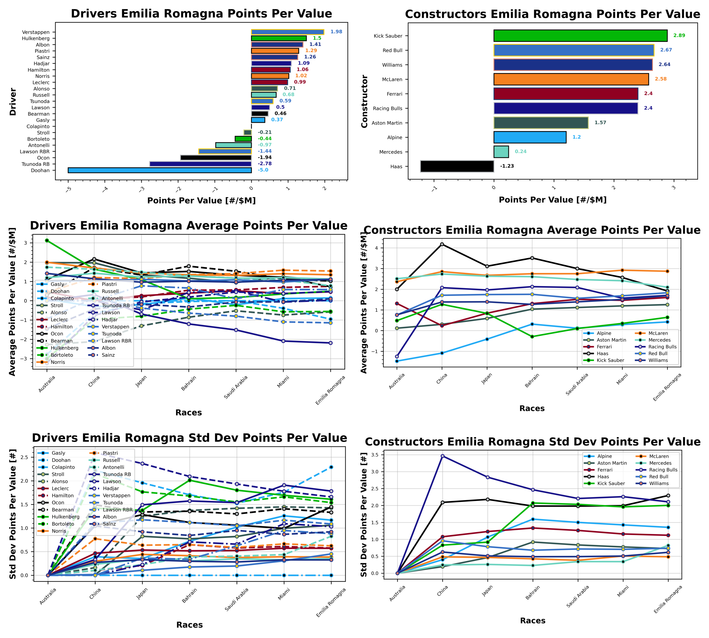 To add to that consistency, we are looking at George Russell and Alex Albon who are scoring 24.29 and 14.0 points per race at the moment, with very little variation there. That’s quite key when it comes to getting the most bang for your buck out of these drivers. As for the teams, Aston may be scoring consistently, but their average of 10 points per race is pretty low. Williams on the other hand are scoring 24 points per race with a good consistency.