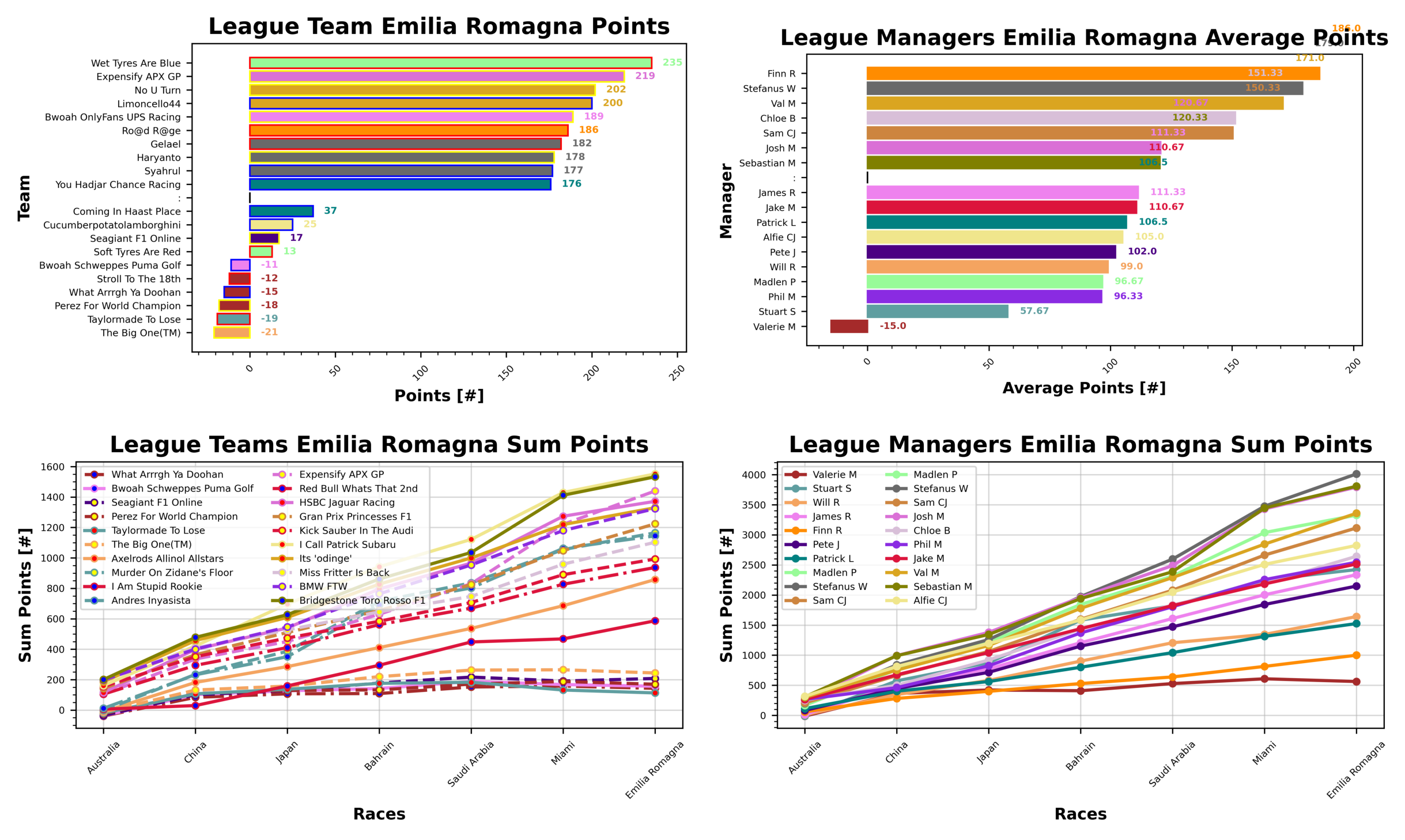 Madlen makes their first appearance at the top of the weekly board in Imola, with their team Wet Tyres Are Blue bringing in 235 points, ahead of Josh and Expensify APX GP with 219 points. Val is a close third with No U Turn, and fourth with Limoncello44, both scoring 202 and 200 points, respectively. James rounds out the top five with a return to form for Bwoah Industries, their team Bwoah OnlyFans UPS Racing bringing in 189 points. Will takes the honours in the golf league this week with their team The Big One, coming home with -21 points. Close behind though, it’s Stuart and Taylormade To Lose with -19 and Valerie with Perez For World Champion with -18 points. Valerie is in fourth and fifth with their teams What Arrrgh Ya Doohan and Stroll To The 18th bringing in -15 and -12 points, respectively.