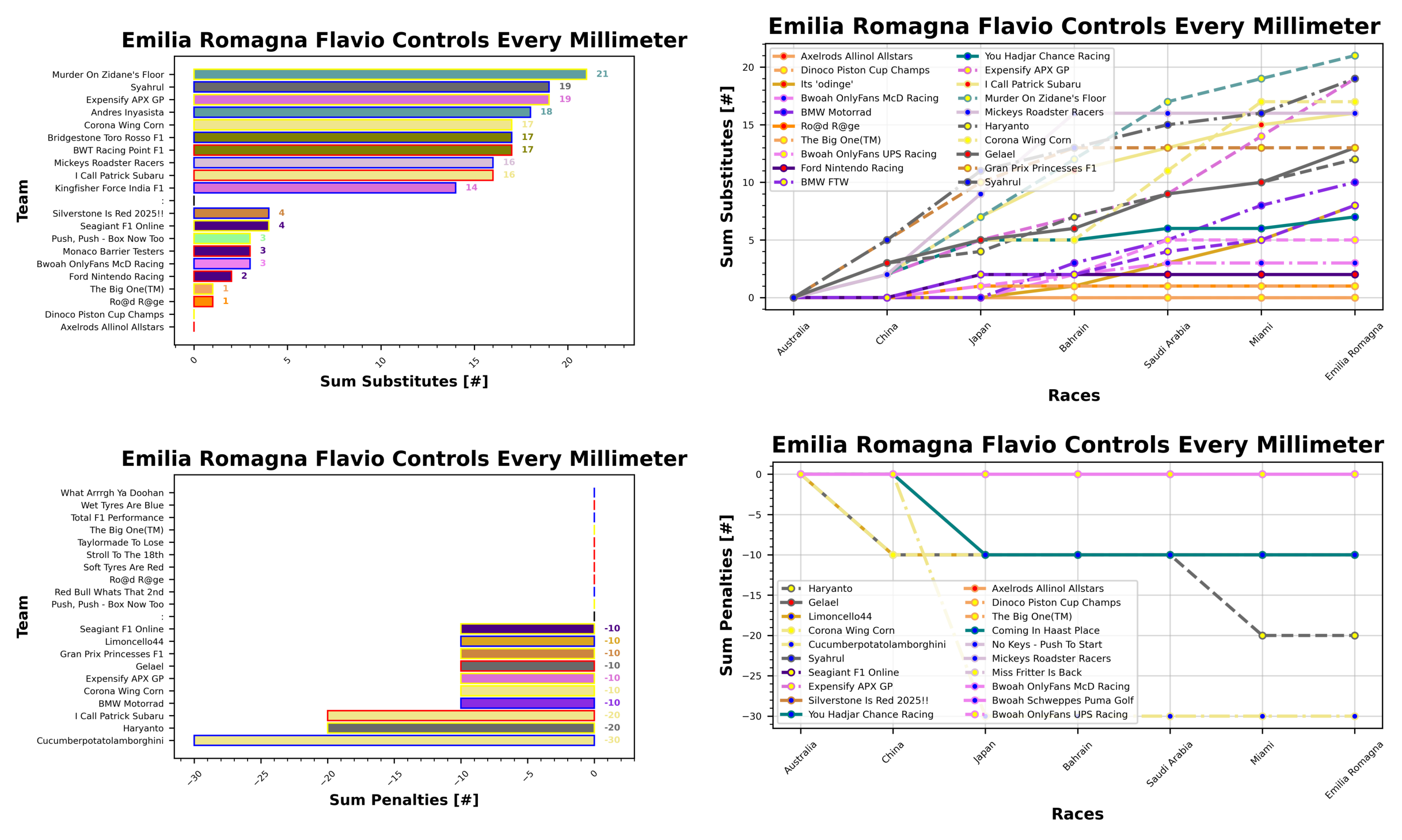 Leading the substitutions award at the moment is Stuart with Murder On Zidane’s Floor with 21 subs so far, ahead of Stefanus with Syahrul on 19 and Josh with Expensify APX GP ties for second, and Stuart is in third with their teams Andres Inyasista with 18. None of these teams have been hit with penalties yet.