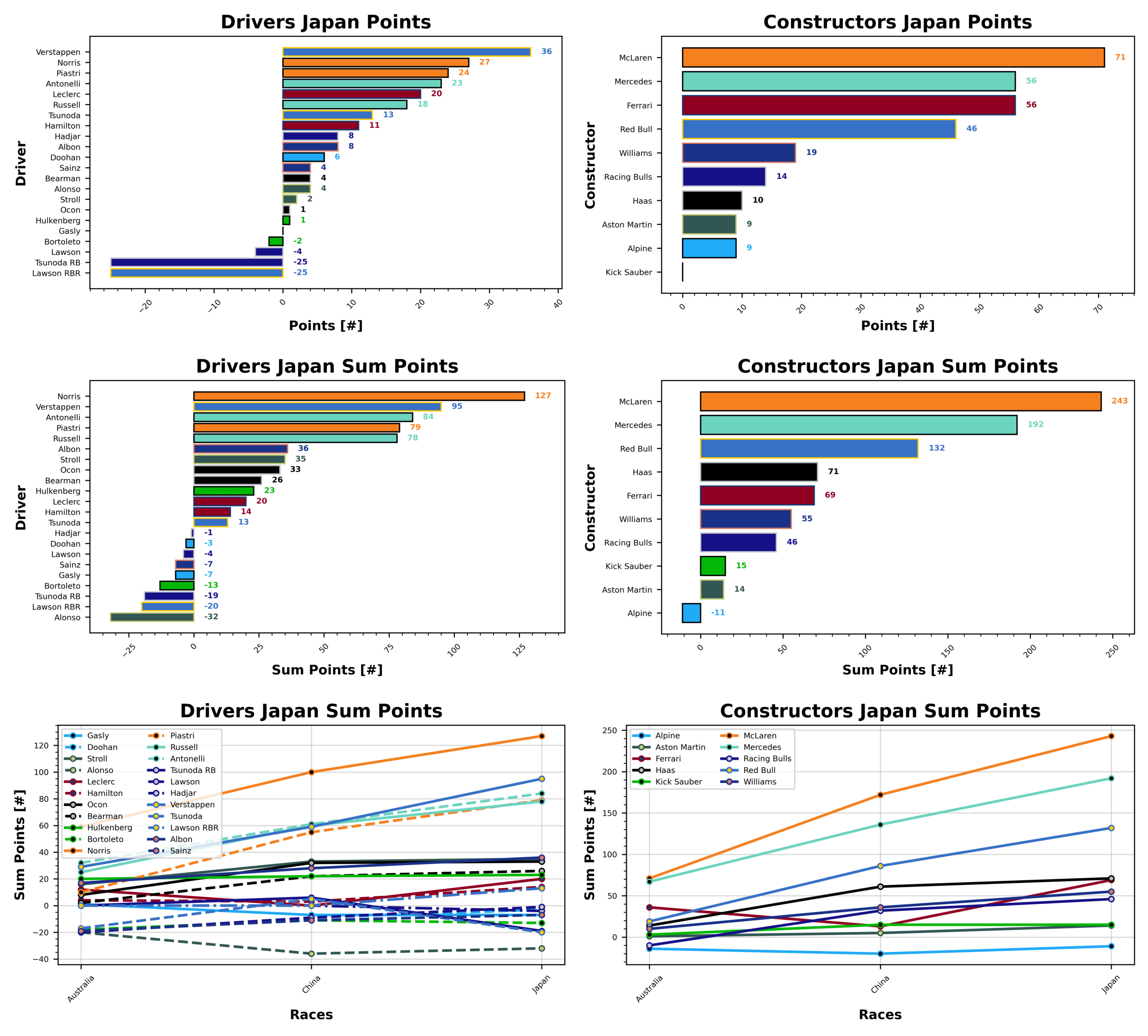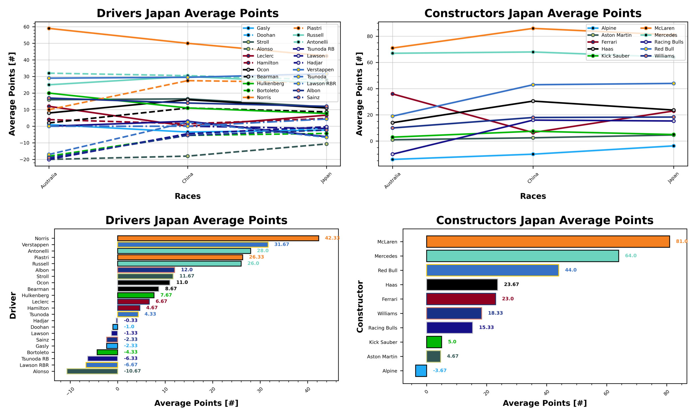 McLaren spend another week at the top of the constructors’ weekly standings with 71 points. Mercedes and Ferrari are tied for second this week, the two former rivals securing 56 points each, ahead of Red Bull in third place with 46 points. Kick Sauber have a pointless weekend in Japan at the bottom of the table, behind Alpine and Aston Martin with a pair of 9s. Haas round out the bottom three with 10 points, though not through lack of trying as Bearman put in a great weekend.