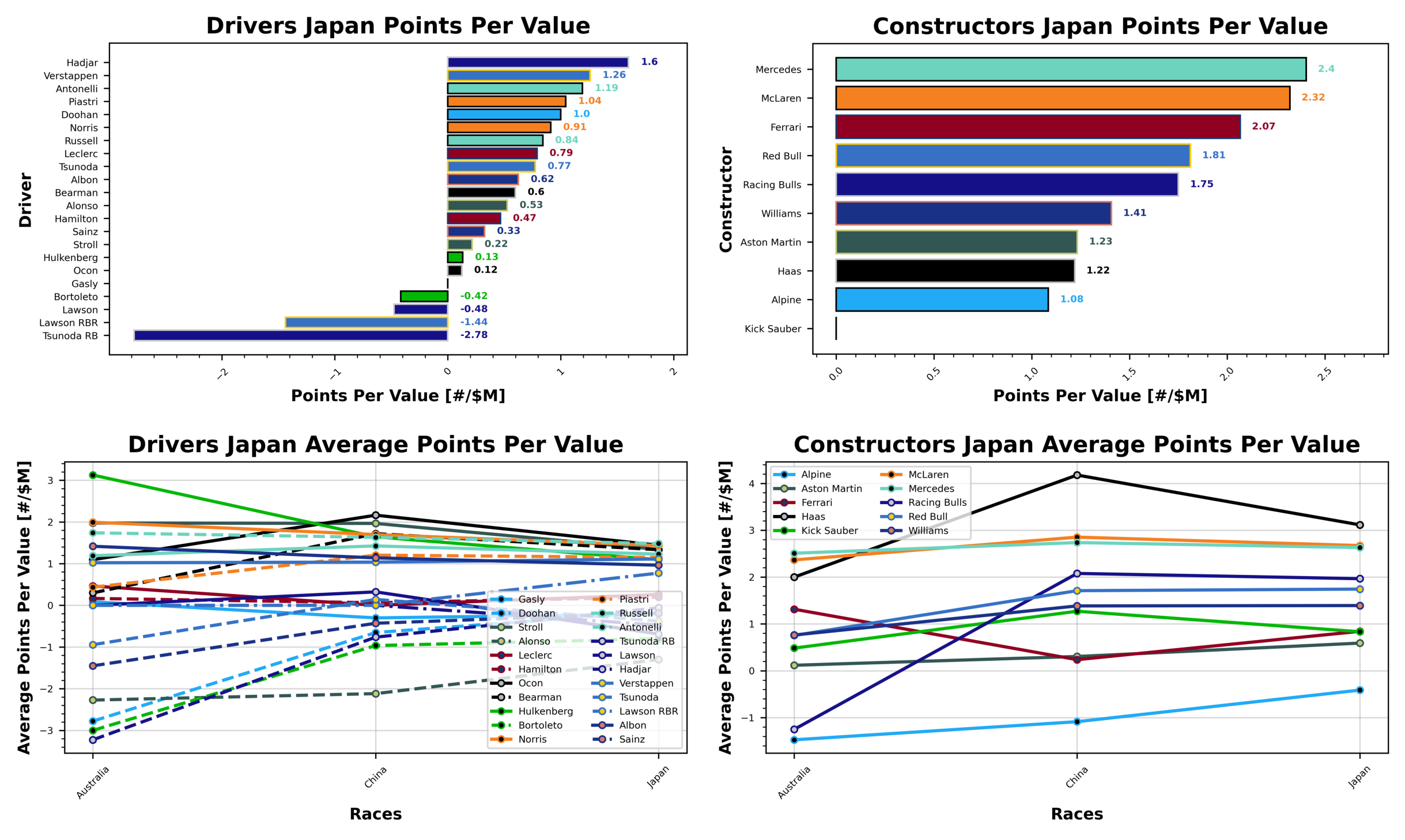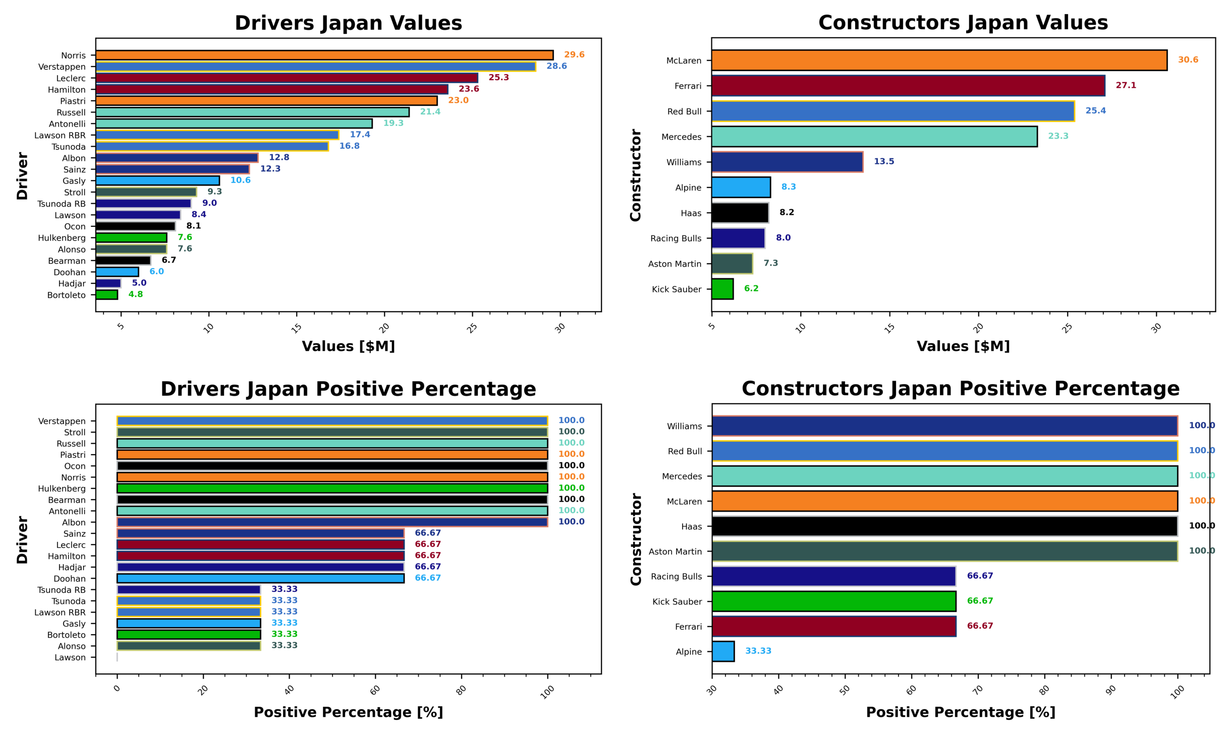 The driver market is quite volatile at the moment, but Lando Norris is still your most expensive option at the moment, worth $29.6. He’s a full $1 higher than Max Verstappen ($28.6). The Ferrari boys next, with Leclerc valued higher than his more experienced teammate, with a value of $25.3 to Lewis’ $23.6. Oscar Piastri is the fifth most expensive token with a value of $23.0. These are values for Japan. Bortoleto represents your cheapest option with a value of $4.8, followed by Hadjar, Doohan, Bearman, and Alonso/Hulkenberg with values of $5.0, $6.0, $6.7, and $7.6.
