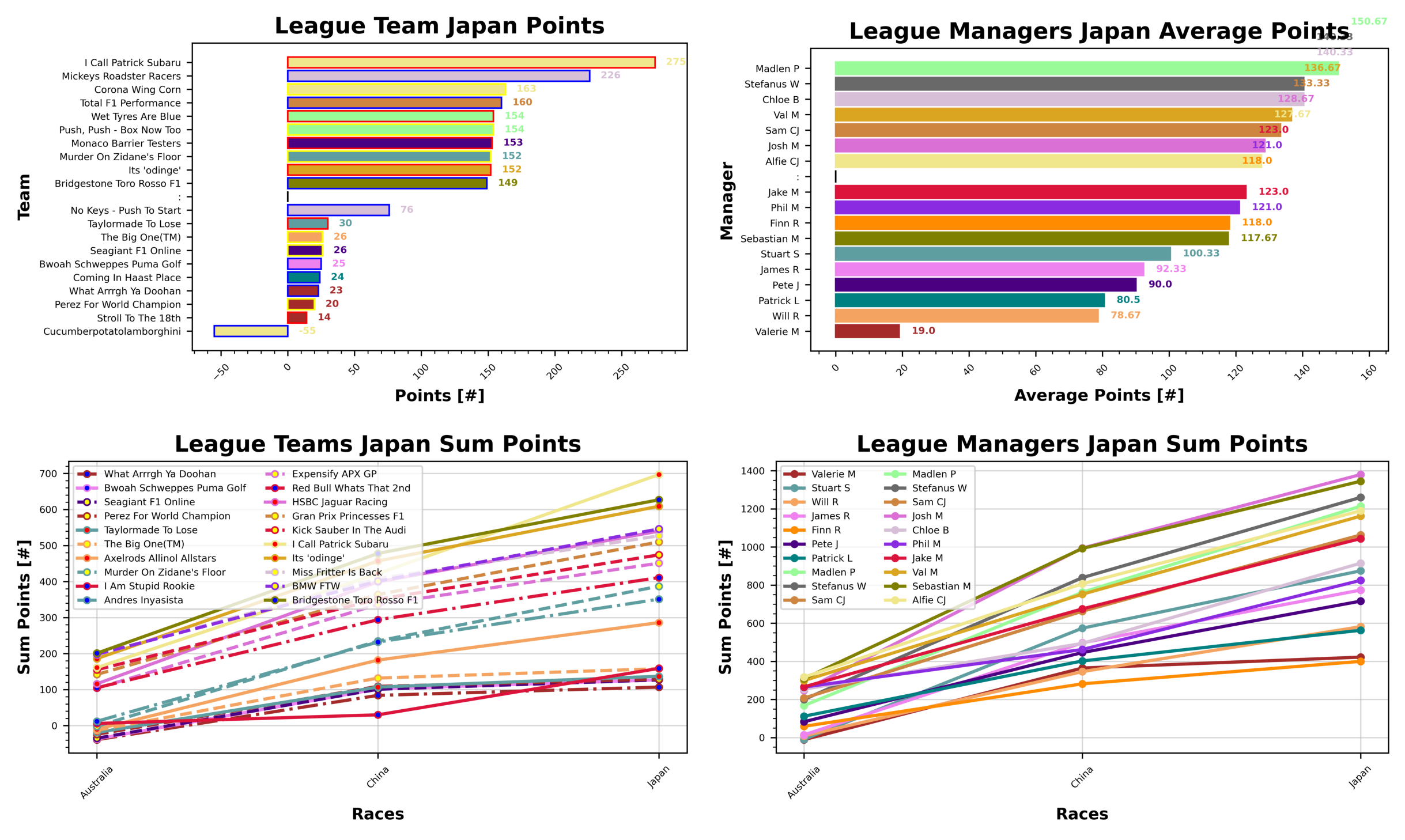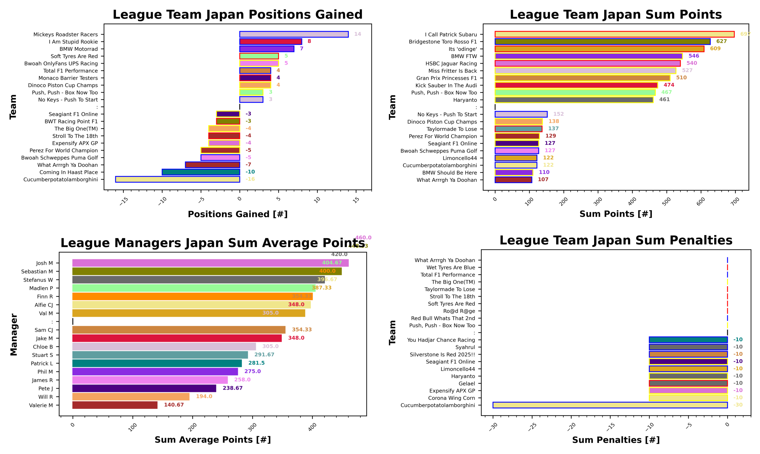Josh, Sebastian, and Stefanus lead the way in average manager points for the season, with 460, 448.33, and 420.0 points, respectively. Our worst manager of the year so far is Valerie with 140.67 points across their teams. Will is next with 194.0, and Pete rounds out the bottom three with 238.67. Our most penalised manager at the moment is Alfie who has taken 3 penalties with cucumberpotatolamborghini and 1 penalty with Corona Wing Corn. Plenty of managers getting caught out by the Tsunoda/Lawson problem this week.
