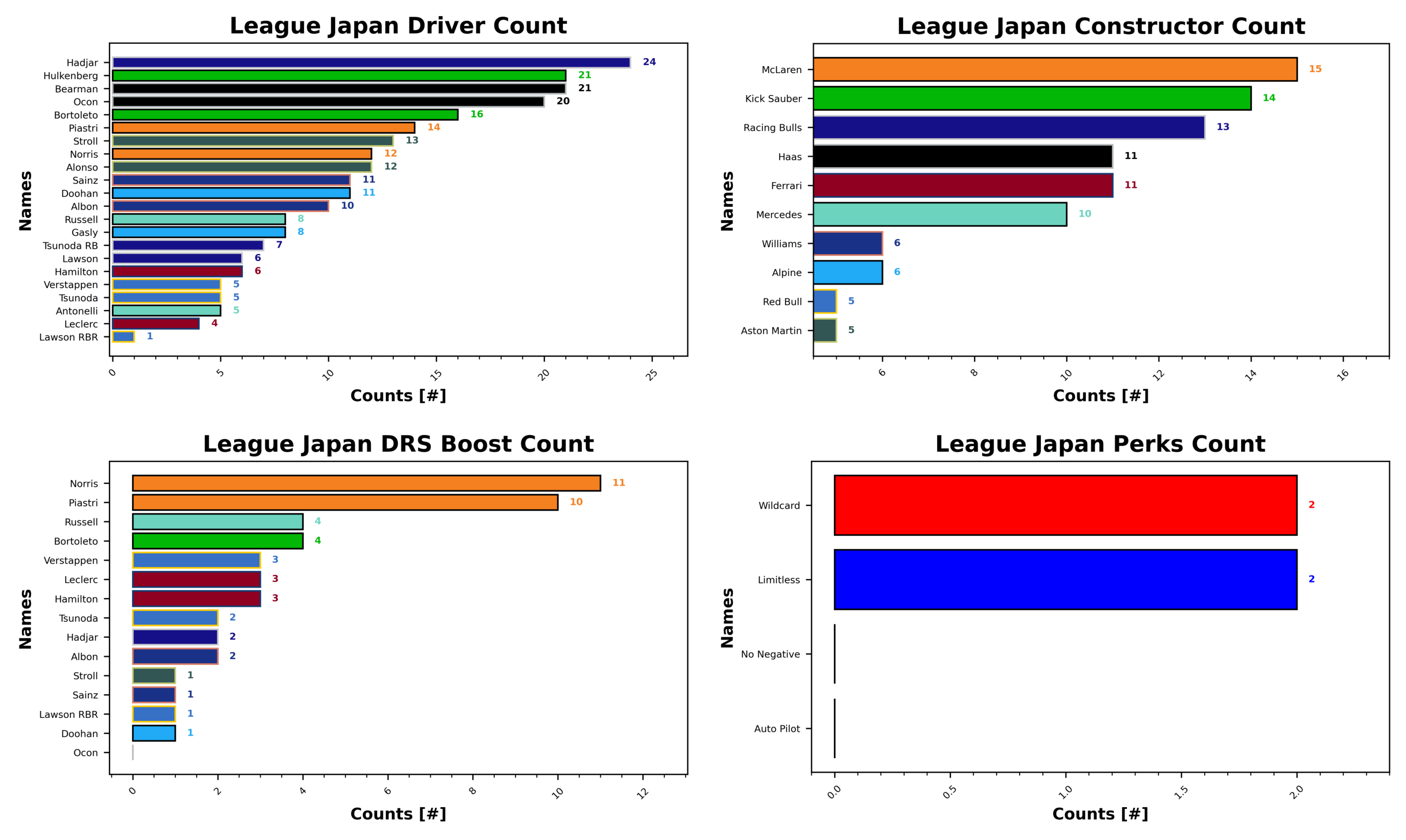Isack Hadjar was your most selected driver this week, making it into your teams 24 times. Hulkenberg and Bearman next with 21 selections across your squads. Ocon is in third with 20 selections, so very popular Haas are this week. Bortoleto is in fourth place with 16 of you choosing the rookie. Oscar Piastri rounds out the top selected drivers with 14. Liam Lawson’s Red Bull token is kicking around somewhere with 1 selection, Charles Leclerc is your least selected driver with 4. Tsunoda, Antonelli, and Verstappen are in third with 5 selections each. Then it’s Lawson and Hamilton with 6, with Yuki Tsunoda’s Racing Bulls token rounding out the bottom five with 7.