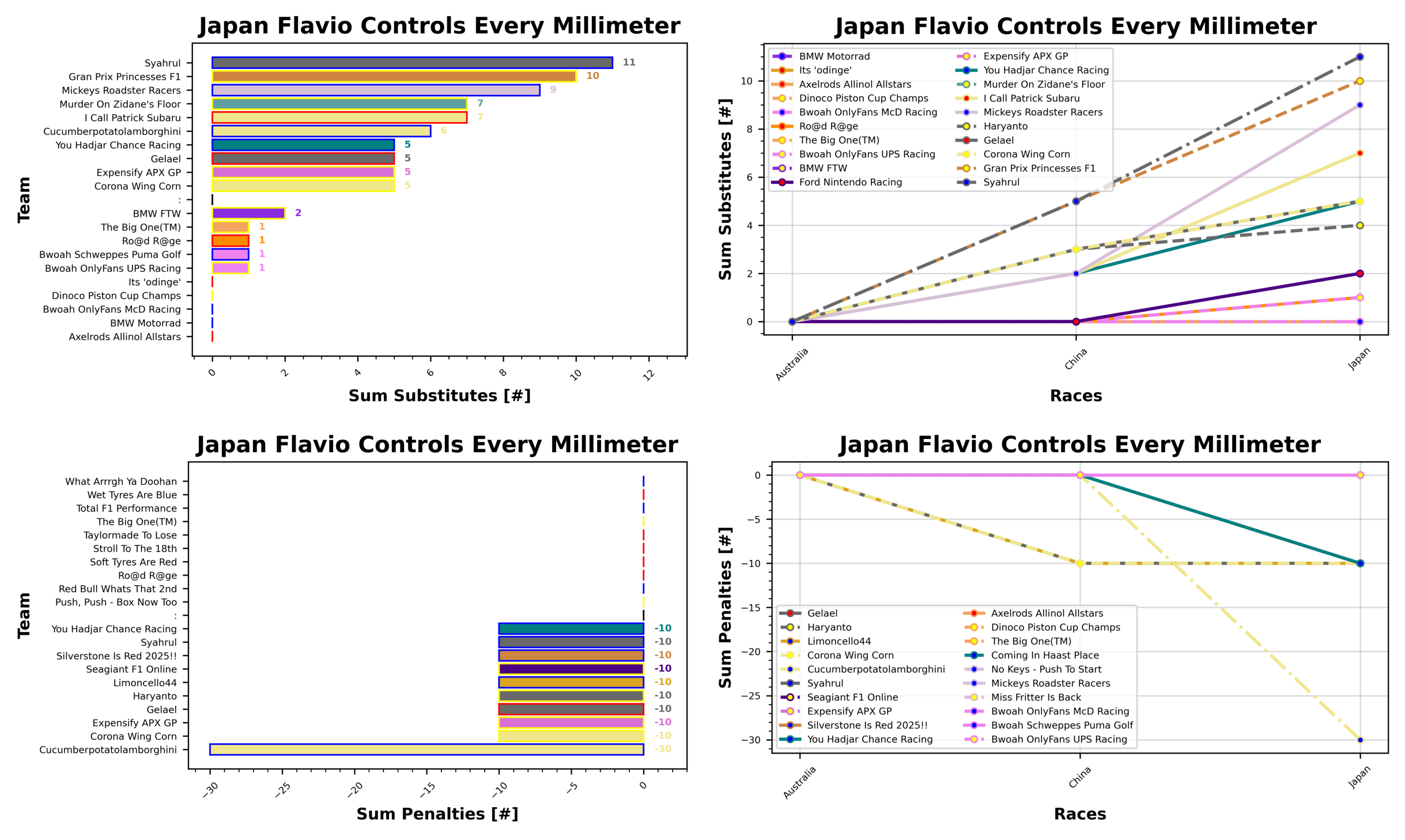 Leading the way on substitutions is Stefanus and Syahrul with 11 total substitutions in 3 races. They’re ahead of Sam and Gran Prix Princesses F1 with 10, and Chloe and Mickeys Roadster Racers with 9. Since these three are all below the penalties threshold, they are currently way out in the lead.