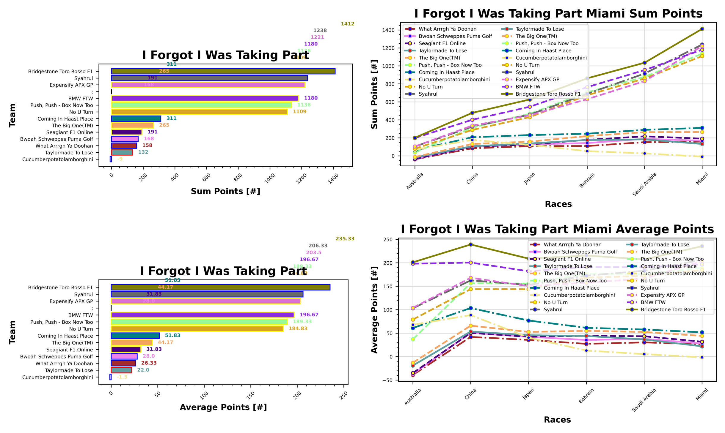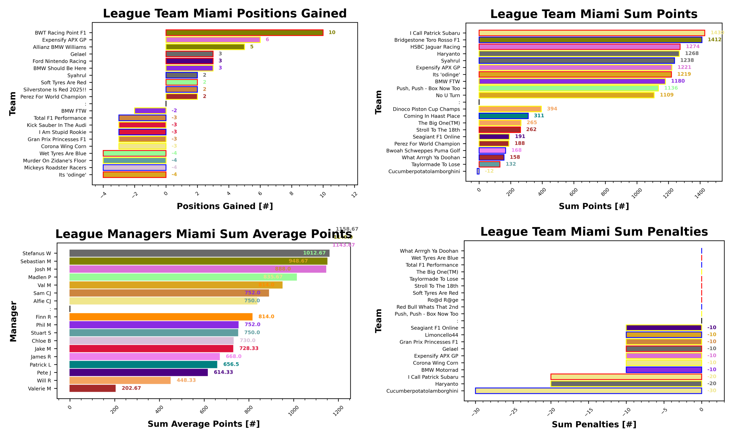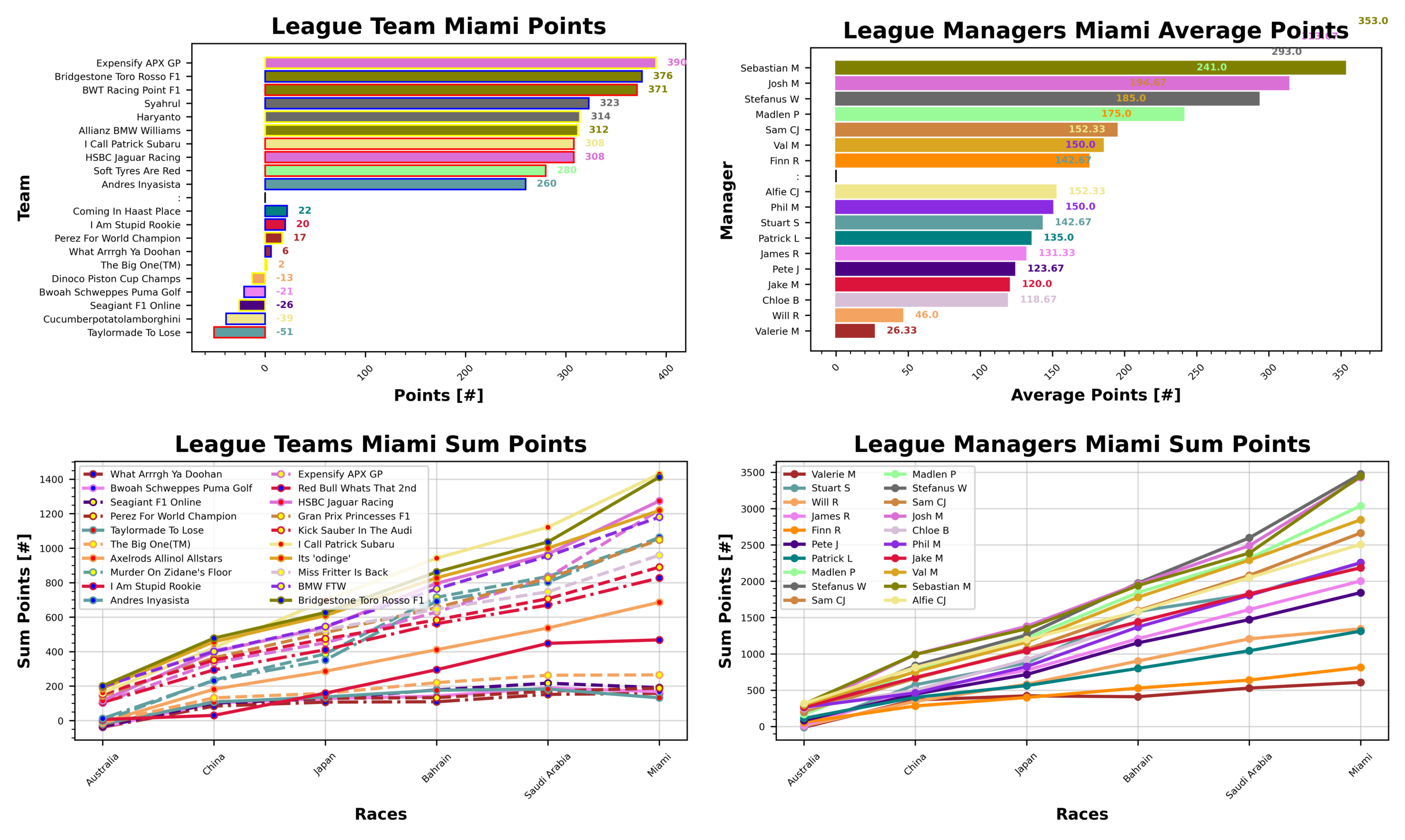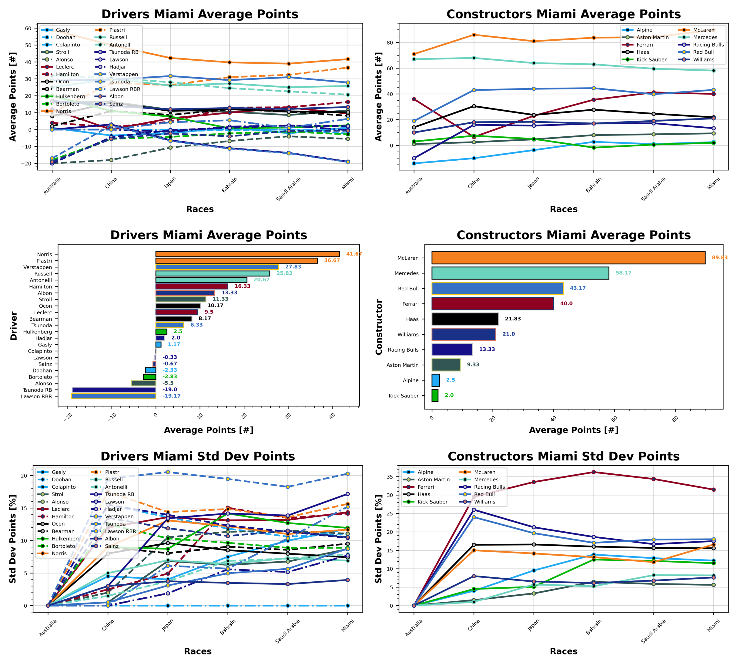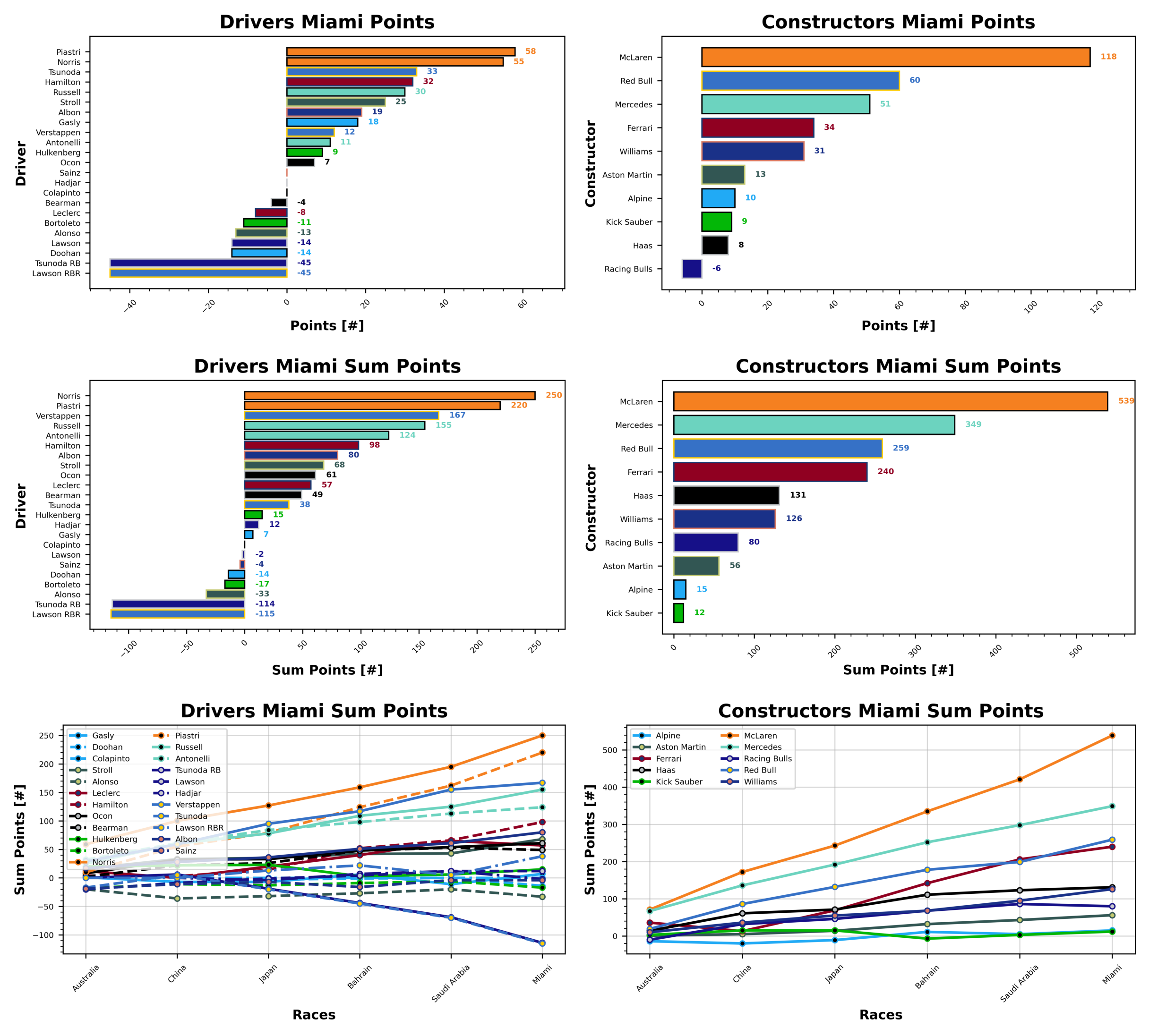 It’s no surprise that McLaren top the weekly table in Miami, bringing home over double the points of their nearest rivals with 118 points. Red Bull are in second with 60 points and Mercedes bring it home in third place with 51. Racing Bulls suffer a negative points haul at the bottom of the table this week with -6 points. Haas are down at the slow end as well with 8 points, followed by Kick Sauber with 9 points.