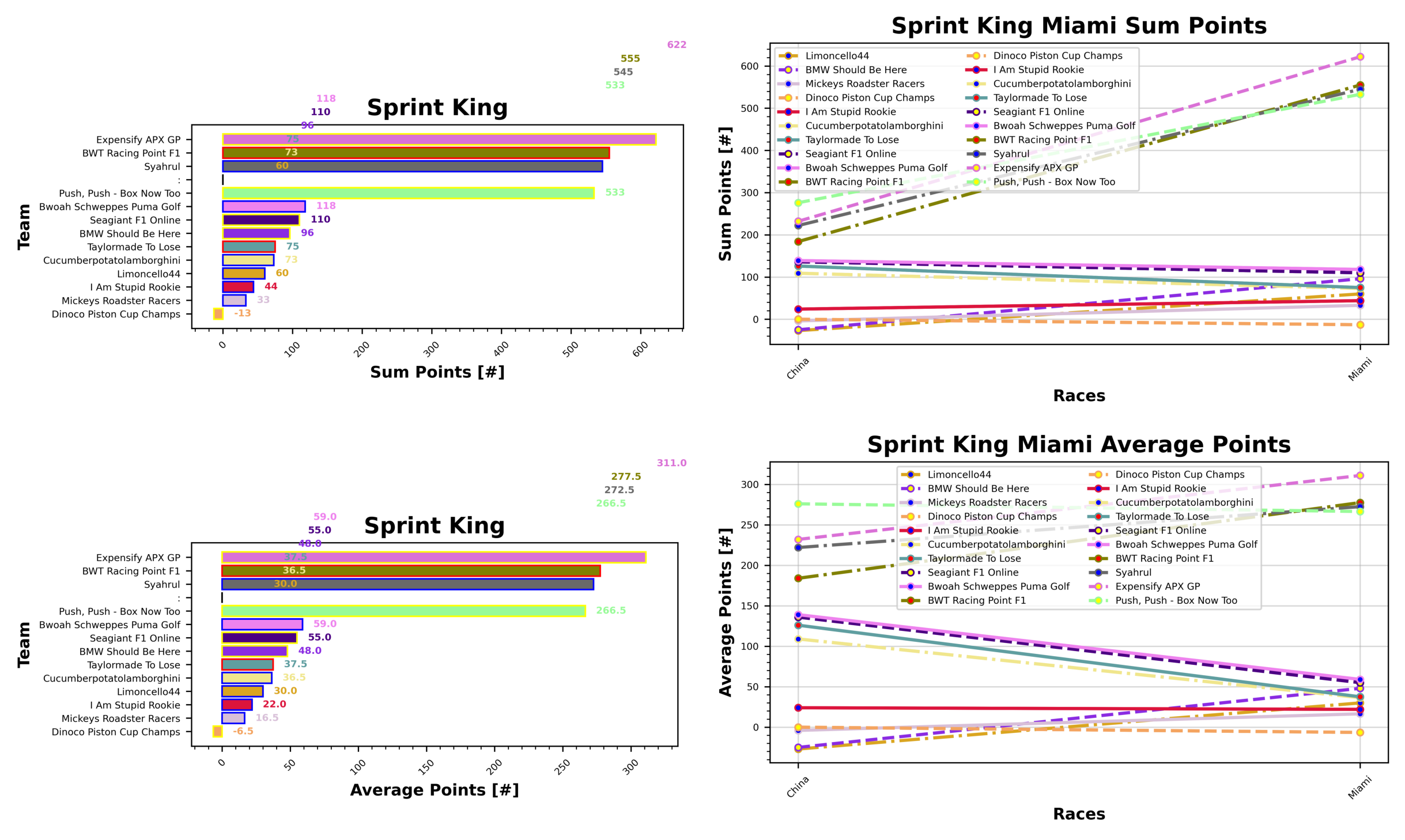 We’ve finally had another sprint race, so let’s see what that’s done to the standings. Josh takes the lead with their other team Expensify APX GP, with 622 points. They’re ahead of Sebastian and BWT Racing Point F1 who have 555 points. In third place it’s Stefanus and Syahrul with 545 points.
