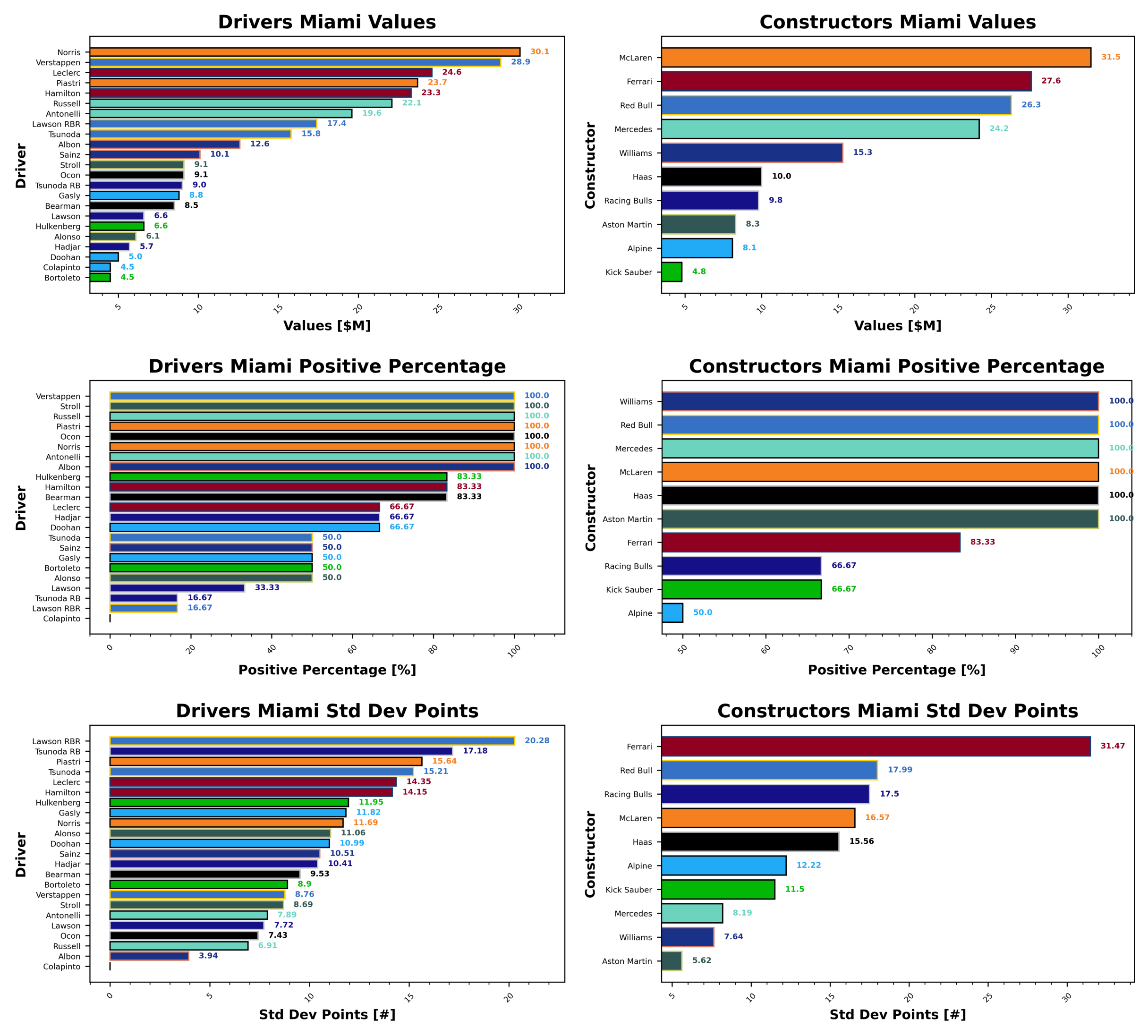 McLaren’s value might now be the highest we’ve ever seen in this fantasy league, and once I get my legacy code sorted, I’ll be able to fact check myself on that one, they now sit at $31.5 ahead of Ferrari in second with a value of $27.6 and Red Bull in third with a value of $26.3. Kick Sauber are approaching that bottom cap with a value of $4.8, behind Alpine at $8.1 and Aston Martin at $8.3.