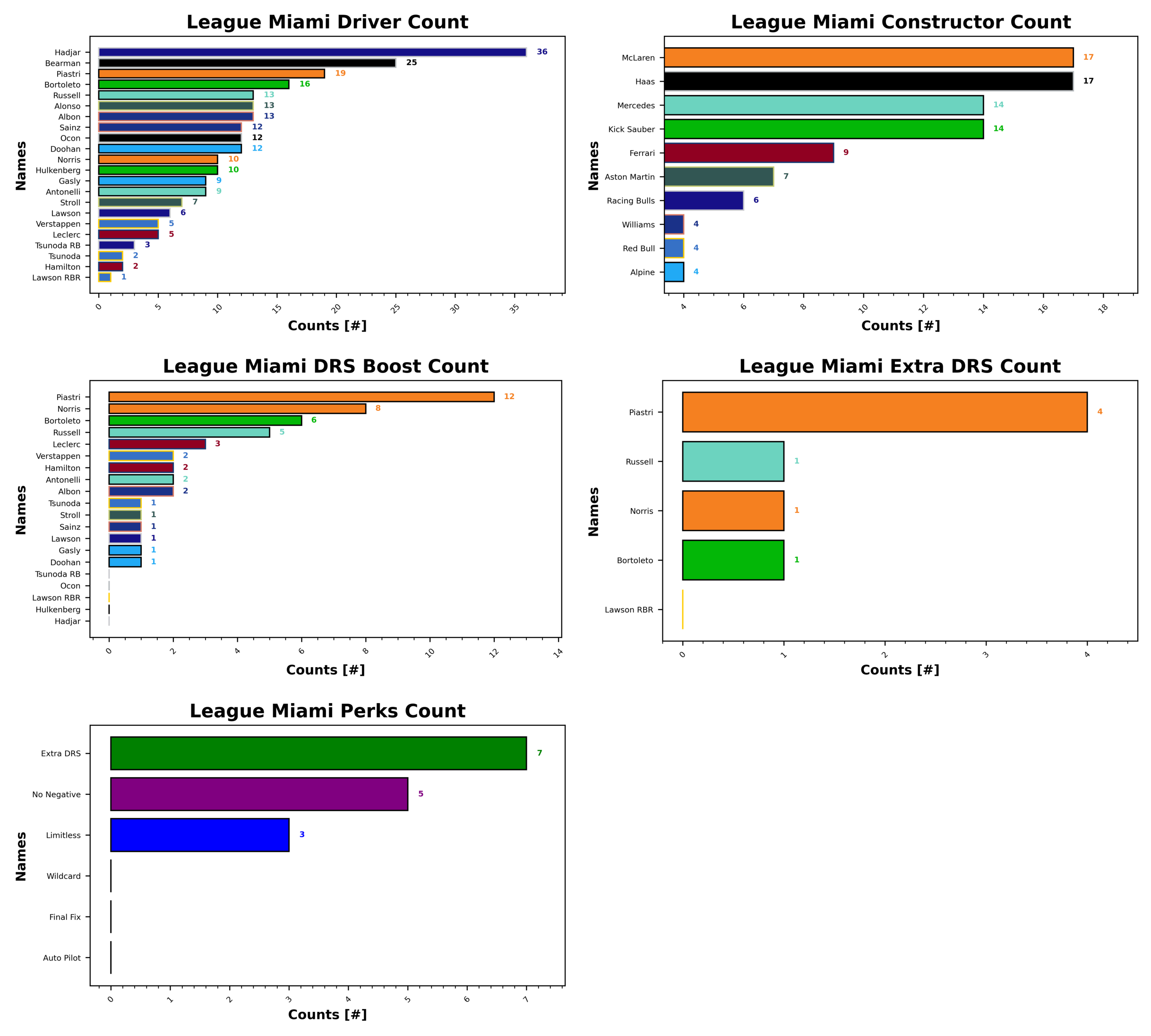 McLaren and Haas are your favourite teams it seems with 17 counts each, followed by Mercedes and Kick Sauber with 14. Ferrari round out the top three with 9. Given all the ties, I’ll just keep going. Aston Martin make it 7, Racing Bulls 6, and Williams, Red Bull, and Alpine are your least selected with 4 each.