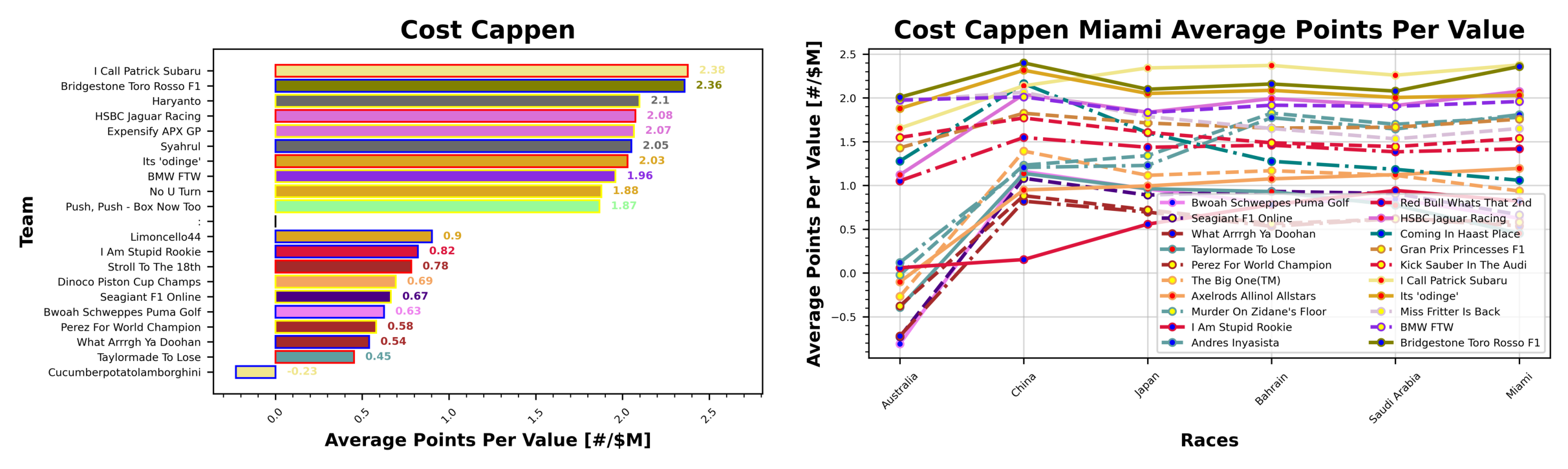 What really matters, though, is the points per value that these drivers and constructors are bringing in, because there is still something to be said for making the most of your limited cost cap. So let’s take a look at that table.
