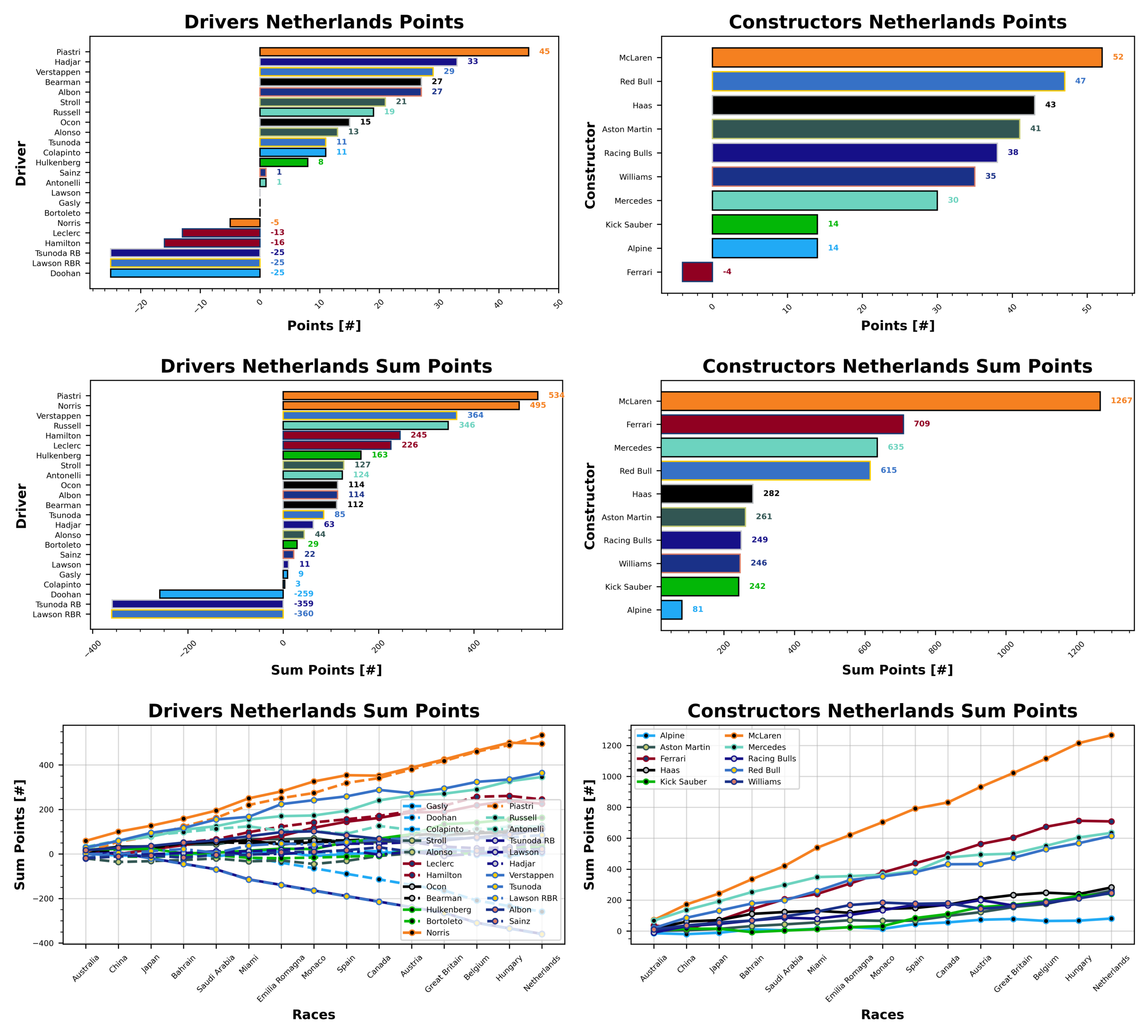 McLaren continue their stranglehold over the season at the top with 1267 points ahead of Ferrari and Mercedes with 709 and 635 points each. Alpine are still yet to hit triple figures with 81 points at the bottom of the table, but then the fight gets really spicy. Kick Sauber drop down to second from last this week with 242 behind Williams with 246 and Racing Bulls with 249 points.