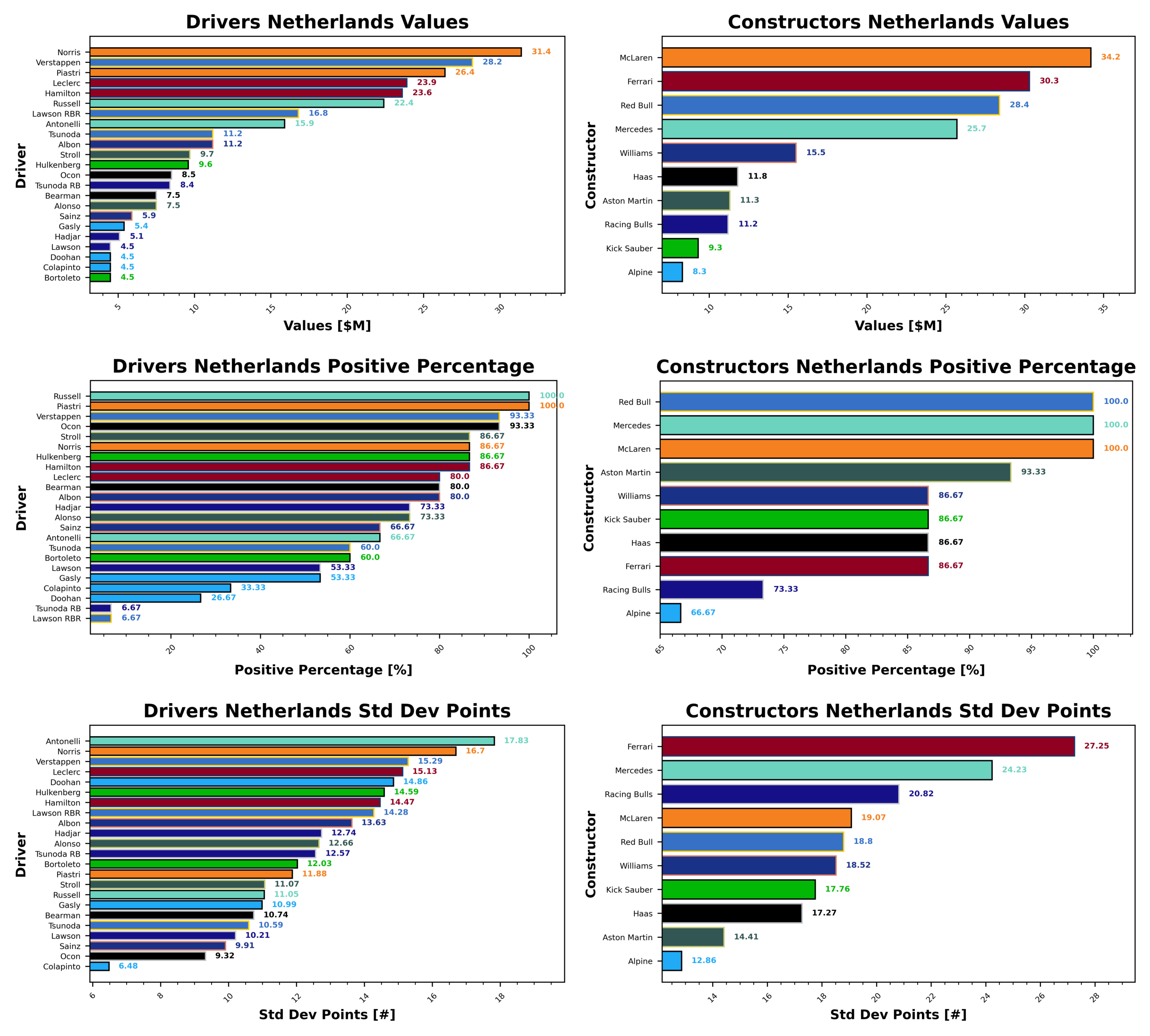 Russell and Piastri maintain their 100% record, I wonder if they can go all season this way. Then it’s Verstappen and Ocon who have dropped 1 race this season, followed by Stroll, Norris, Hulkenberg, and Hamilton as your third most positive scorers. Colapinto remains at the bottom, scoring positively in only 1/3 of the races this season, followed by teammate Gasly and Lawson just above 50%. Tsunoda and Bortoleto are next at 60%, followed by Sainz and Antonelli, who scored positively at 2/3 of the races this year. Hadjar and Alonso round out the bottom five, just under 3/4 of the races scored with positive points.