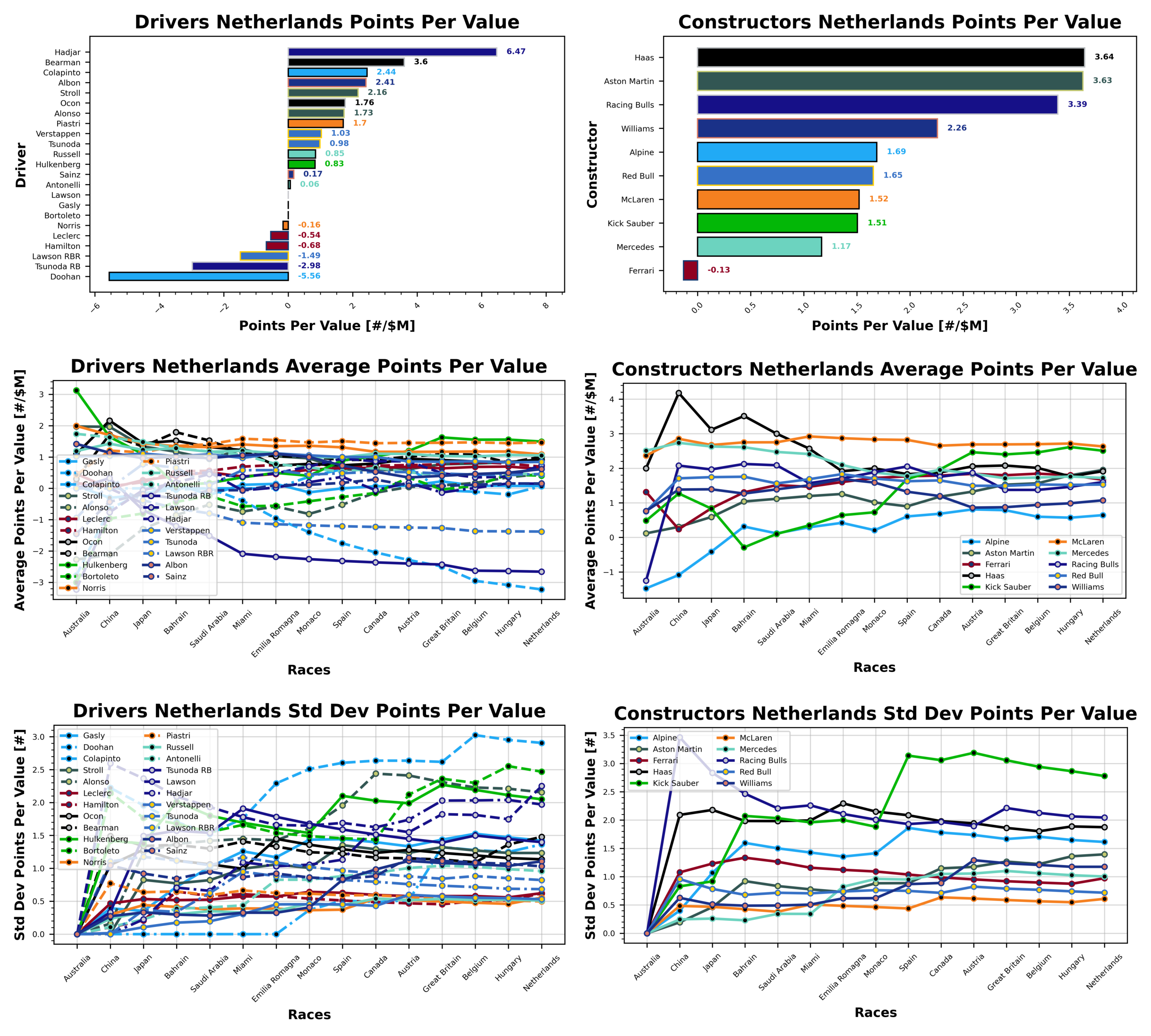 Your driver of the week this week couldn’t have been anyone else but Isack Hadjar, who not only took his first Formula 1 podium in his debut season, but he brings home a points per value of 6.47 ppm. Ollie Bearman, who had a very underrated race, is in second with 3.6 ppm, ahead of Franco Colapinto with 2.44 ppm. Alex Albon is next with 2.41 ppm, followed by Lance Stroll with 1.76 ppn. Your worst driver of the week was Lewis Hamilton with -0.68 ppm, followed by Leclerc (-0.54 ppm), Norris (-0.16 ppm), Bortoleto/Gasly/Lawson with 0 ppm, and Kimi Antonelli with 0.06 ppm.