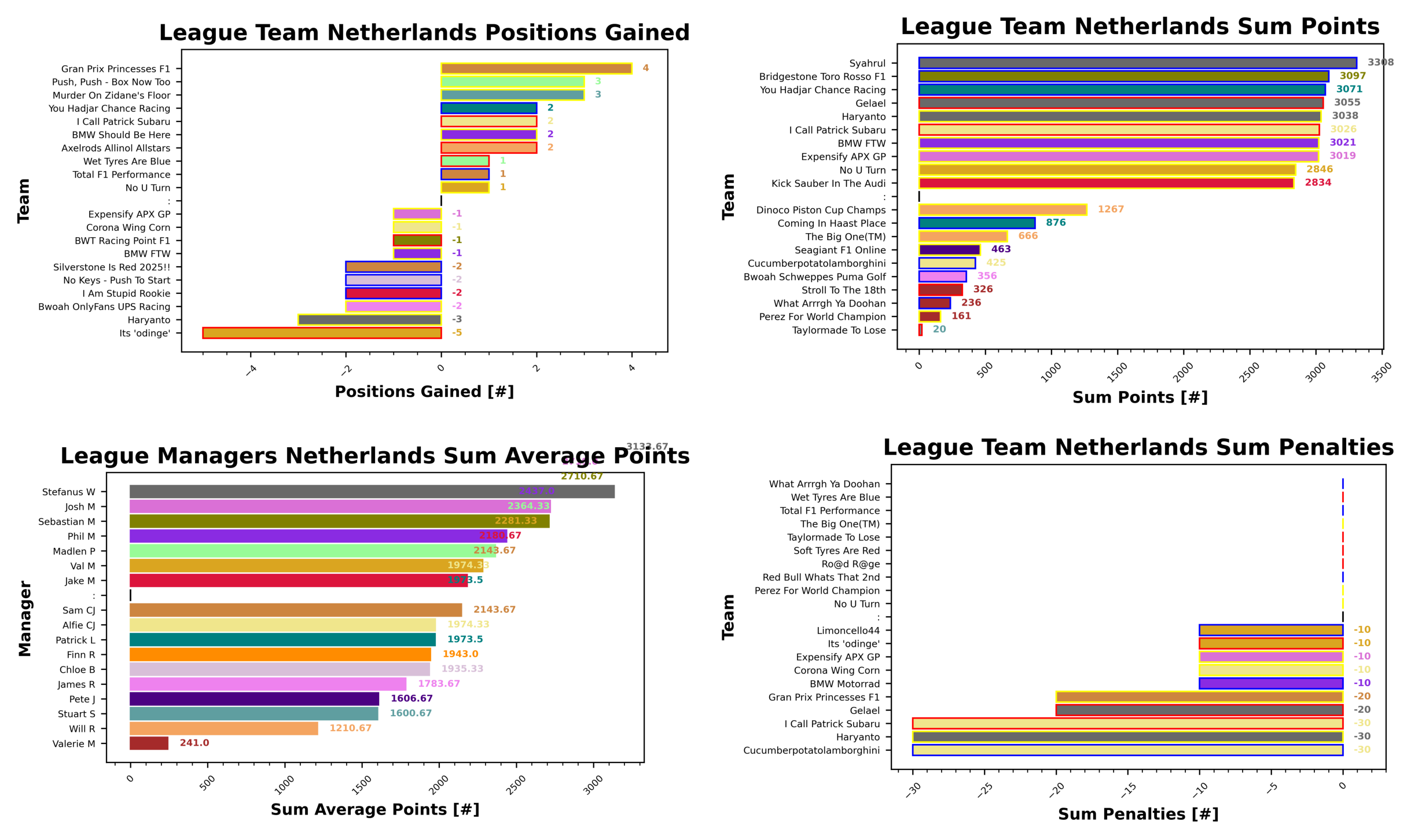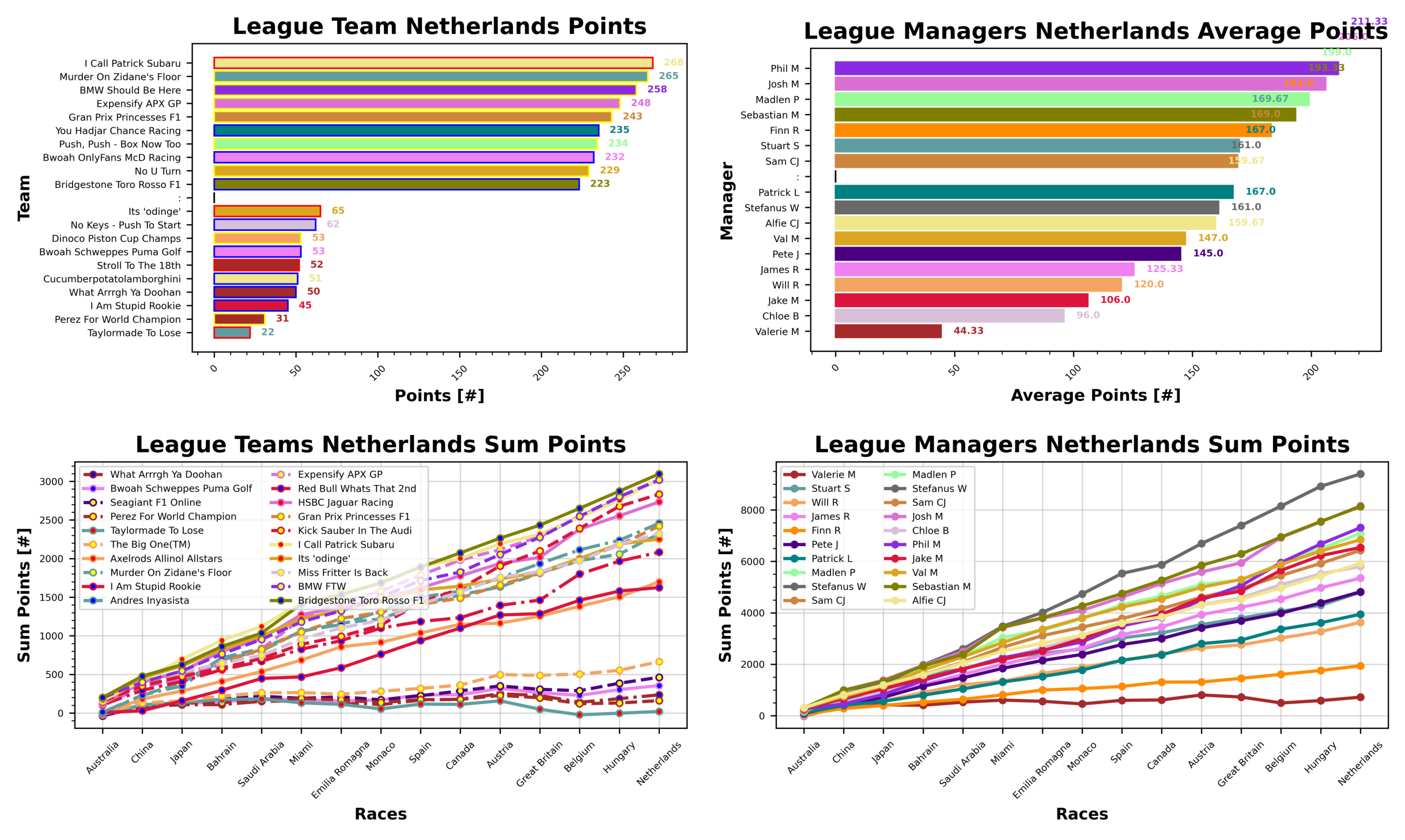 Stuart and Taylormade To Lose seem to have the Golf League sealed up at the moment with 20 points to their name. Valerie occupies the next three positions with Perez For World Champion, What Arrrgh Ya Doohan, and Stroll to the 18th with 161, 236, and 326 points. James and Bwoah Schweppes Puma Golf round out the bottom five with 356.