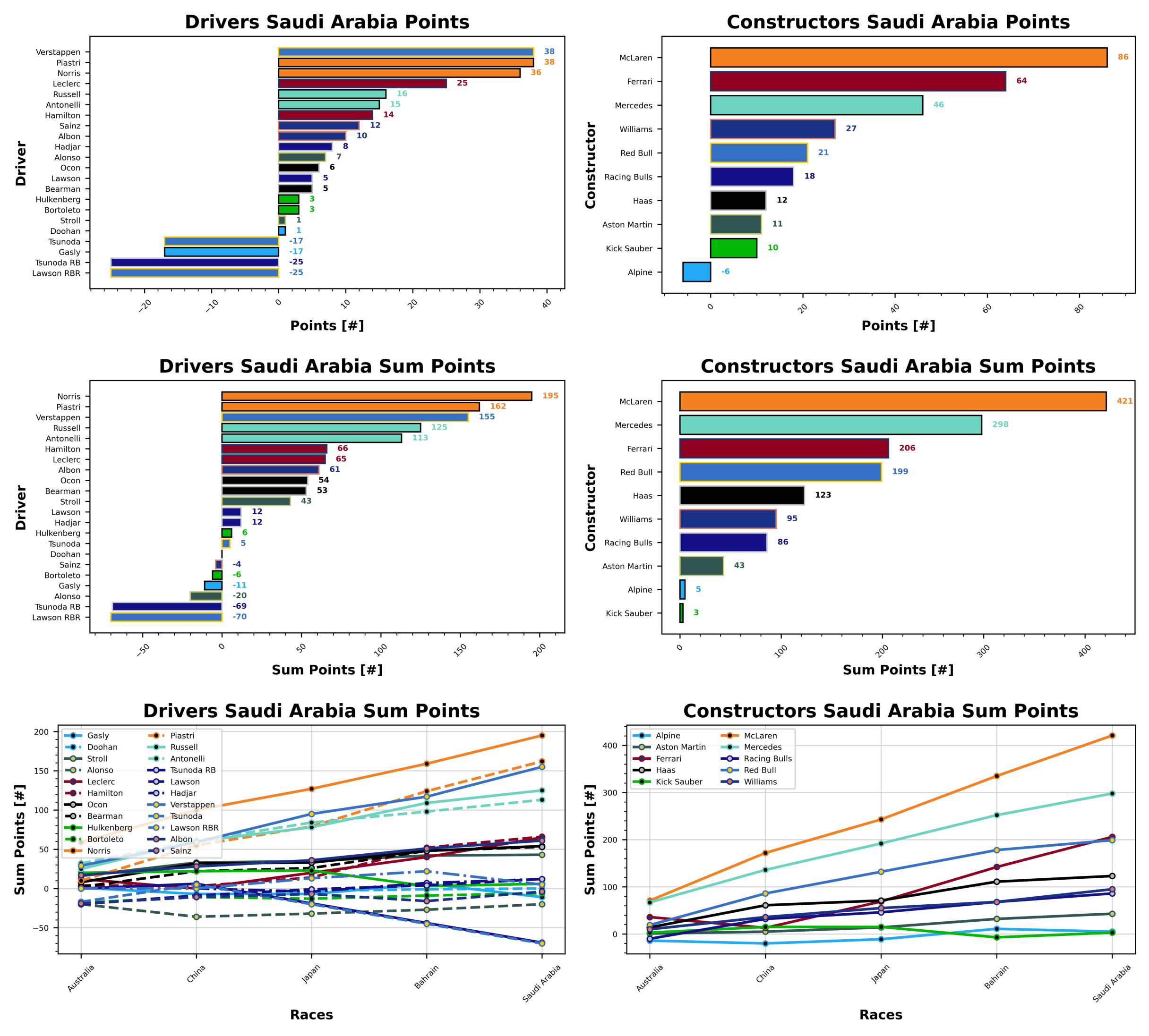 This week, the pole sitter and the race winner tied for the top score, Max Verstappen and Oscar Piastri both bring 38 points home from the Saudi Grand Prix ahead of fantasy championship leader Lando Norris who recovered well to score 36 points. Podium finisher Charles Leclerc is in fourth place with 25 points, and Mr consistent, George Russell, rounds out the top five with 16 points. Our DNF drivers were at the bottom this week, both suffering a -17 points haul. Then it’s Jack Doohan and Lance Stroll, with a pair of ones, followed by the Kick Sauber duo with a pair of threes. It’s two by two, with Lawson and Bearman both getting five points, and Esteban Ocon rounds out the bottom five with 6 points.
