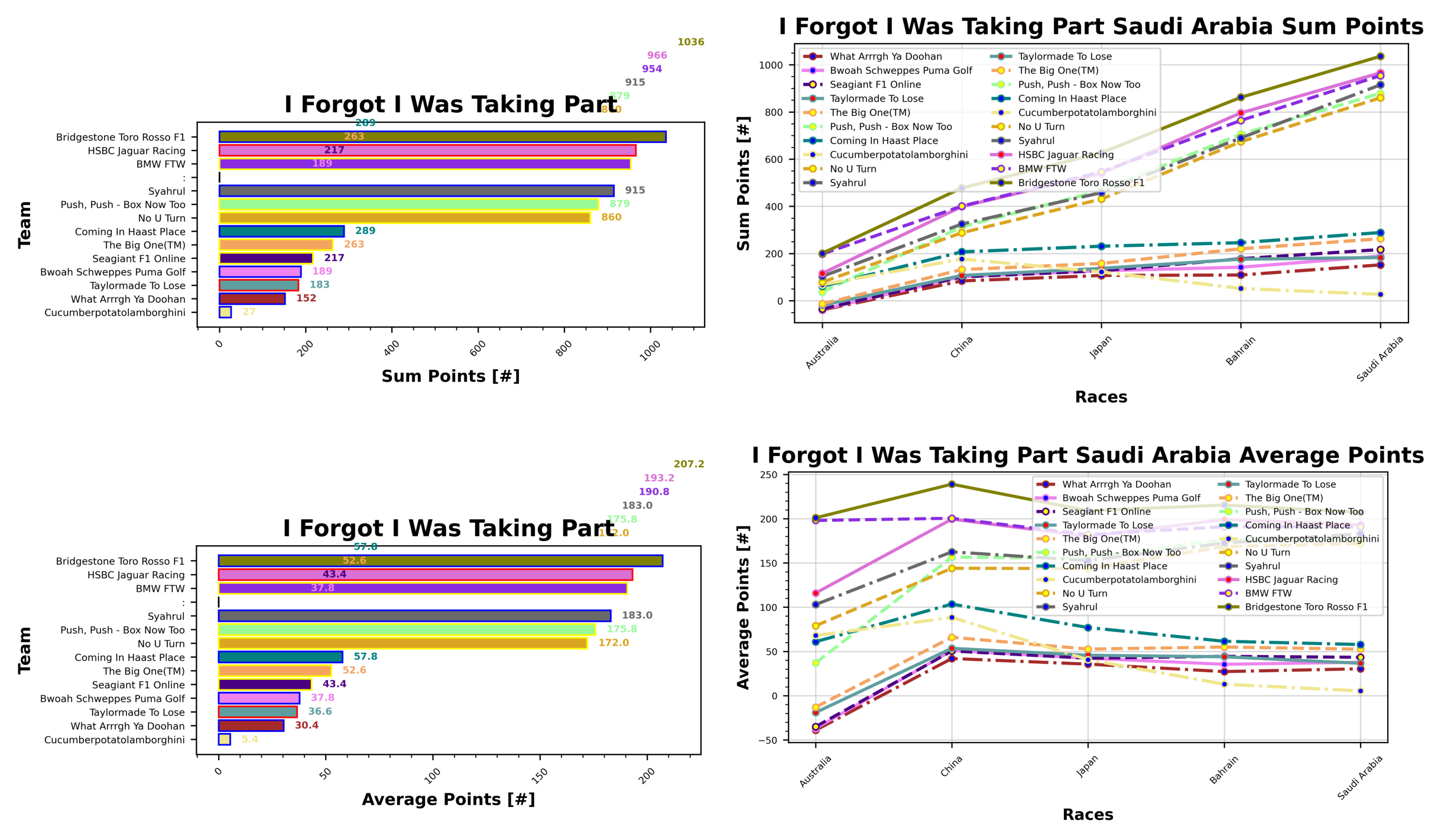 Alfie bookends the entire field, with their team Cucumberpotatolamborghini now sitting in last place with 27 points ahead of Valerie with What Arrrgh Ya Doohan and Perez For World Champion with 152 and 171 points, respectively. Stuart is in fourth with Taylormade To Lose with 183 points, and James rounds out the bottom five with Bwoah Schweppes Puma Golf and 189 points.