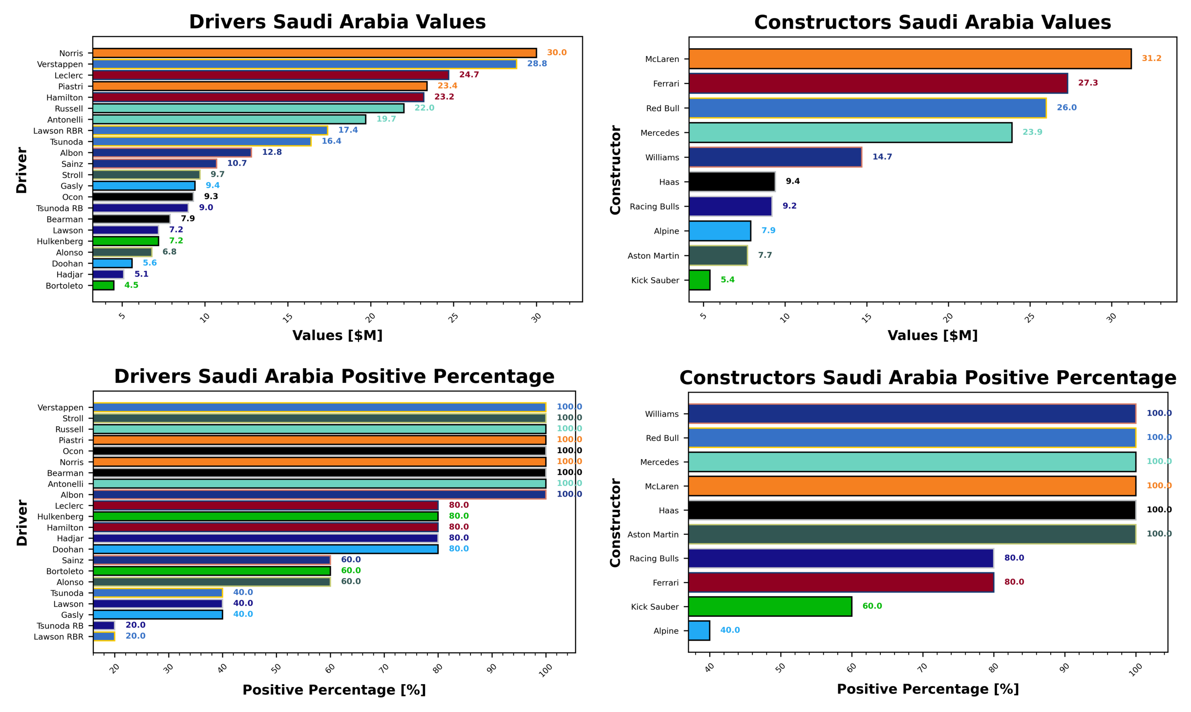 McLaren was your most expensive constructor this week, with a value of $31.2, ahead of Ferrari at $27.3 and Red Bull at $26. Kick Sauber were your cheapest team this week with $5.4, behind Aston Martin with $7.7 and Alpine with $7.9.