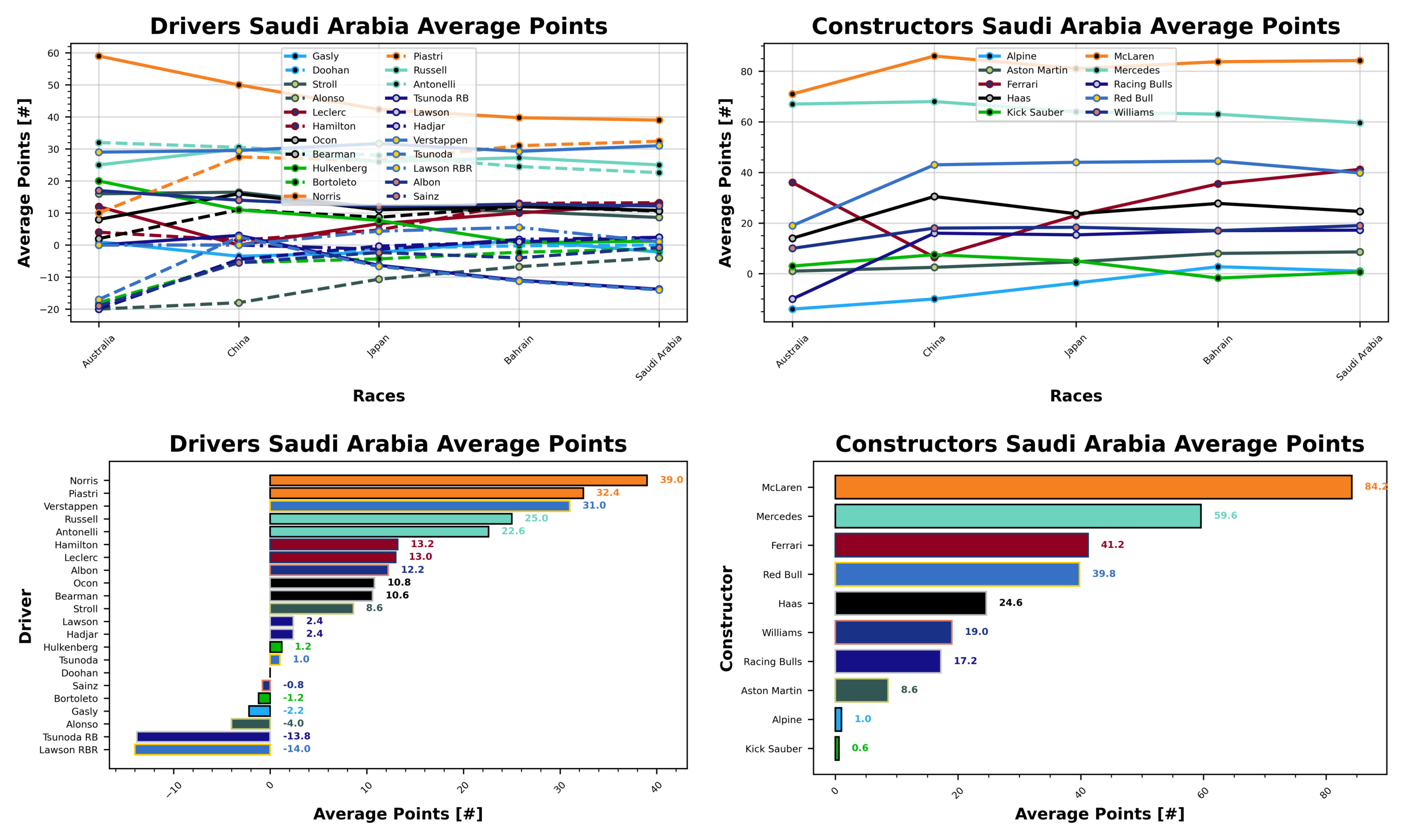 Championship leader, Lando Norris’ average points tally is trending downwards as he suffers another average week in the standings. He now sits at 39 points per race. Oscar Piastri is sitting at 32.4 points per race, ahead of Max Verstappen with 31 points per race. George Russell has 25 points per race, ahead of teammate Kimi Antonelli with 22.6 points per race. Fernando is showing signs of improvements lately, he is now averaging a loss of 4 points per race, behind Pierre Gasly with -2.2 points per race. Gabriel Bortoleto next who is pulling in -1.2 points per race behind Carlos Sainz with -0.8 points per race. Jack Doohan has averaged 0 points per race to round out the bottom five.