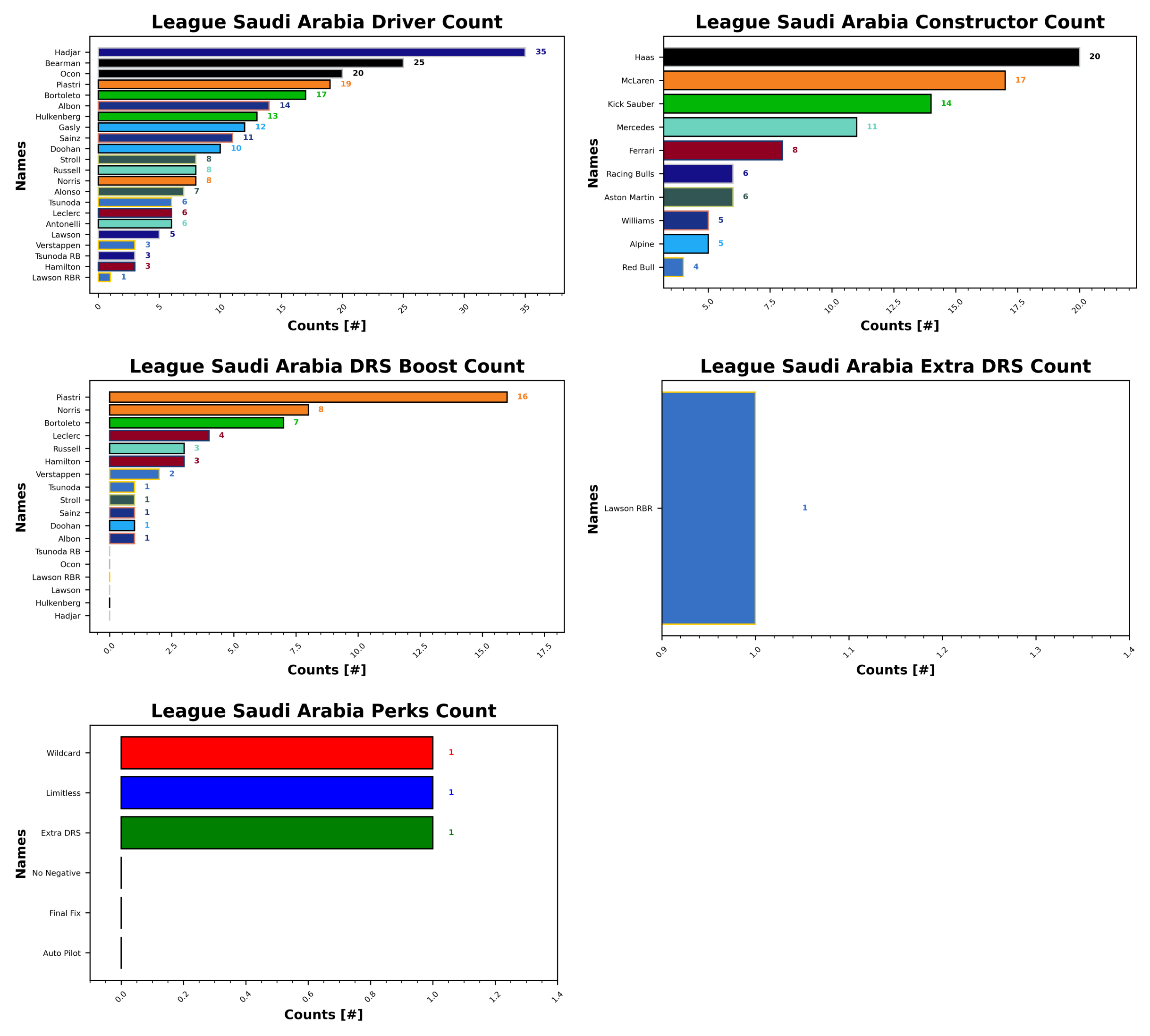 Haas make 20 selections this week, and are the most popular ahead of McLaren with 17 and Kick Sauber with 14. Red Bull are your least used team in Saudi, with only 4 of you choosing the former champions. Alpine and Williams are next with 5 selections each, followed by Racing Bulls and Aston Martin with 6 selections.