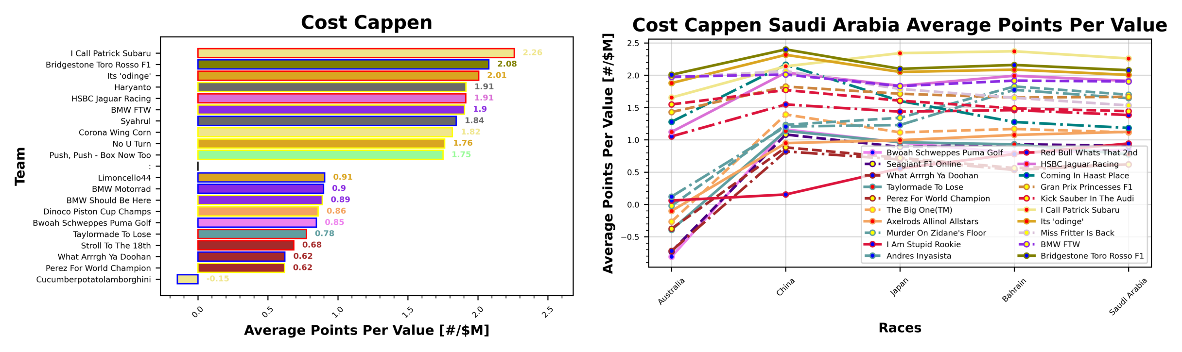 Holding onto the lead this week is Alfie, who takes a points per value of 2.26 ppm with I Call Patrick Subaru, ahead of Sebastian with Bridgestone Toro Rosso F1 with 2.08, and Val with Its ‘odinge’ with 2.01 ppm. This competition will run all year, but it’s nice to keep a track of it.